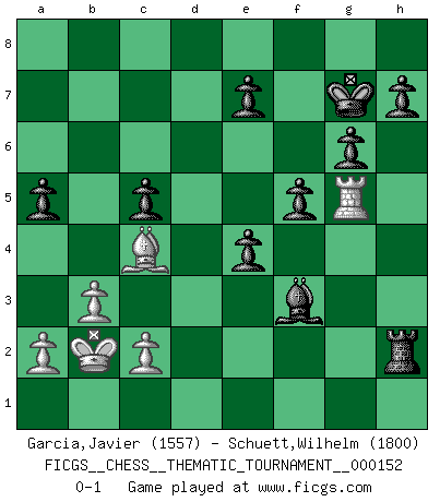 Last move : 0-1 2013 February 21 14:32:32 [Event "FICGS__CHESS__THEMATIC_TOURNAMENT__000152"] [Site "FICGS"] [Date "2012.09.30"] [Round "1"] [White "Garcia,Javier"] [Black "Schuett,Wilhelm"] [Result "0-1"] [WhiteElo "1557"] [BlackElo "1800"] 1.e4 c5 2.Nf3 d6 3.d4 cxd4 4.Nxd4 Nf6 5.Nc3 g6 6.Be3 Bg7 7.f3 O-O 8.Qd2 Nc6 9.Nxc6 bxc6 10.O-O-O Qa5 11.Kb1 Rb8 12.b3 Rd8 13.g4 Nxg4 14.fxg4 Bxc3 15.Qc1 Bxg4 16.Rd3 c5 17.Bd2 Bxd2 18.Qxd2 Qxd2 19.Rxd2 a5 20.Rg1 Bf3 21.e5 dxe5 22.Rxd8+ Rxd8 23.Bd3 e4 24.Bc4 Rd2 25.Kc1 Rxh2 26.Kb2 Kg7 27.Rg5 f5 0-1 Sicilian : Dragon, Yugoslav attack, 7...O-O Kingside Castling by player Black (move 7) Queenside Castling by player White (move 10) Player Black won this chess game. Follow this game move after move (download)I have never in my life played the French Defence, which is the dullest of all openings. (Wilhelm Steinitz) Das typische an einem Großmeister ist, daß er eine gewonnene Position schnell und schmerzlos gewinnt. (Irving Chernev) Aquellos que dicen entender al Ajedrez, no entienden nada. (Robert Hubner) A chaque perte on perd un peu de soi. (Joël Lautier) They misunderestimated me. (George W. Bush, Bentonville nov. 6, 2000)
