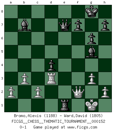 Last move : 0-1 2012 December 13 6:6:9 [Event "FICGS__CHESS__THEMATIC_TOURNAMENT__000152"] [Site "FICGS"] [Date "2012.09.30"] [Round "1"] [White "Bromo,Alexis"] [Black "Ward,David"] [Result "0-1"] [WhiteElo "1188"] [BlackElo "1805"] 1.e4 c5 2.Nf3 d6 3.d4 cxd4 4.Nxd4 Nf6 5.Nc3 g6 6.Be3 Bg7 7.f3 O-O 8.Qd2 Nc6 9.Nxc6 bxc6 10.Bd3 e5 11.O-O d5 12.exd5 cxd5 13.Bc5 Re8 14.Bb5 Re6 15.Rad1 Bb7 16.f4 exf4 17.Qxf4 Rc8 18.Bxa7 Qa5 19.Bd4 Rxc3 20.Bxc3 Qxb5 21.Bxf6 Bxf6 22.b3 Qc5+ 23.Kh1 Qd6 24.Qf2 Qe7 25.Rfe1 Bh4 26.g3 Bg5 27.Rd3 d4 28.Kg1 Rxe1+ 0-1 Sicilian : Dragon, Yugoslav attack, 7...O-O Kingside Castling by player Black (move 7) Kingside Castling by player White (move 11) Player Black won this chess game. Follow this game move after move (download)Fischer Chess play was always razor-sharp, rational and brilliant. One of the best ever. (Dave Regis) Ich las kürzlich ein Buch von Nietzsche. Er sagte Religion verdumme nur die Menschen. Ich stimme zu. (Robert James Fischer) Cuando tu no sabes absolutamente que mas hacer, es tiempo de entrar en pánico. (John van der Wiel) Tous ces prétendus hommes politiques sont les pions, les Cavaliers, les Tours ou les Fous d'une partie d'échecs qui se jouera tant qu'un hasard ne renversera pas l'échiquier. (Honoré de Balzac) Never was anything great achieved without danger. (Niccolo Machiavelli)