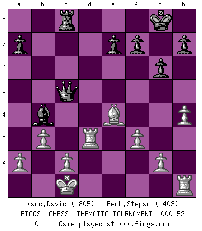 Last move : 0-1 2013 June 15 18:28:27 [Event "FICGS__CHESS__THEMATIC_TOURNAMENT__000152"] [Site "FICGS"] [Date "2012.09.30"] [Round "1"] [White "Ward,David"] [Black "Pech,Stepan"] [Result "0-1"] [WhiteElo "1805"] [BlackElo "1403"] 1.e4 c5 2.Nf3 d6 3.d4 cxd4 4.Nxd4 Nf6 5.Nc3 g6 6.Be3 Bg7 7.f3 O-O 8.Qd2 Nc6 9.O-O-O d5 10.Nxc6 bxc6 11.exd5 Nxd5 12.Nxd5 cxd5 13.Qxd5 Qc7 14.Qc5 Qb7 15.b3 Bf5 16.Bd3 Rac8 17.Qa5 Rc3 18.Bxf5 Rxe3 19.Be4 Qb8 20.h4 Qf4 21.Qd2 Bc3 22.Qxe3 Qxe3+ 23.Kb1 Qc5 24.Rd3 Rc8 25.Kc1 Bb4 0-1 Sicilian : Dragon, Yugoslav attack, 7...O-O Kingside Castling by player Black (move 7) Queenside Castling by player White (move 9) Player Black won this chess game. Follow this game move after move (download)The essence of Chess is thinking about what Chess is. (David Bronstein) Das ganze Leben mit einer Ehefrau ist wie ein Endspiel mit ungleichfarbigen Läufern. (Viktor Kortschnoi) Botvinnik trató de alejar el misterio referente al Ajedrez, siempre relacionandolo a situaciones de la vida diaria. Solía llamar al Ajedrez un problema inexacto típico, similar a aquellos en que la gente tiene siempre que resolver a cada día. (Garry Kasparov) Aidez vos pièces, elles vous aideront. (Paul Morphy) Wipe them out. All of them. (Darth Sidious in Star Wars ep.1)