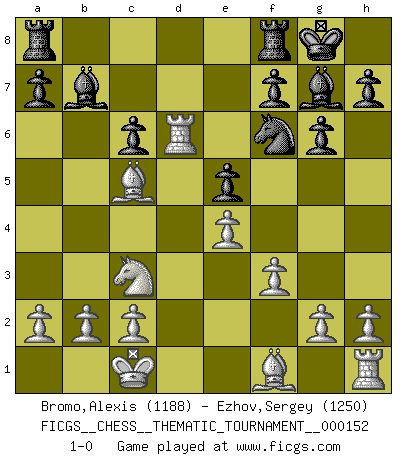 Last move : 1-0 2012 December 26 23:8:59 [Event "FICGS__CHESS__THEMATIC_TOURNAMENT__000152"] [Site "FICGS"] [Date "2012.09.30"] [Round "1"] [White "Bromo,Alexis"] [Black "Ezhov,Sergey"] [Result "1-0"] [WhiteElo "1188"] [BlackElo "1250"] 1.e4 c5 2.Nf3 d6 3.d4 cxd4 4.Nxd4 Nf6 5.Nc3 g6 6.Be3 Bg7 7.f3 O-O 8.Qd2 Nc6 9.Nxc6 bxc6 10.O-O-O e5 11.Qxd6 Qxd6 12.Rxd6 Bb7 13.Bc5 1-0 This chess game has been lost on time (started : 2012.09.30 14:14:39) Sicilian : Dragon, Yugoslav attack, 7...O-O Kingside Castling by player Black (move 7) Queenside Castling by player White (move 10) Player White won this chess game. Follow this game move after move (download)There is only one thing Fischer does in Chess without pleasure: to lose ! (Boris Spassky) Wenn Du nicht kämpfst, um anderen etwas zu beweisen, sondern nur für Dich selbst, dann bist du fast unbesiegbar. (Garry Kasparov) ¿Quién es tu oponente esta tarde? Esta tarde mi oponente son las piezas negras. (Akiba Rubinstein) On n'a jamais que l'âge auquel on a commence à jouer aux échecs car après on cesse de vieillir. (Capablanca) I find television to be very educating. Every time somebody turns on the set, I go in the other room and read a book. (Groucho Marx)