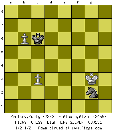 Last move : 1/2-1/2 2012 September 30 18:58:33 [Event "FICGS__CHESS__LIGHTNING_SILVER__000231"] [Site "FICGS"] [Date "2012.09.30"] [Round "1"] [White "Perikov,Yuriy"] [Black "Alcala,Alvin"] [Result "1/2-1/2"] [WhiteElo "2380"] [BlackElo "2456"] 1.e4 c5 2.Nf3 d6 3.d4 cxd4 4.Nxd4 Nf6 5.Nc3 a6 6.h3 e5 7.Nde2 h5 8.Bg5 Be7 9.Qd2 Be6 10.O-O-O Nbd7 11.f4 Nc5 12.Qe3 b5 13.a3 Rb8 14.fxe5 Ng4 15.Bxe7 Nxe3 16.Bxd8 Nxd1 17.Bc7 Nf2 18.Rg1 Rc8 19.exd6 Ncxe4 20.a4 Rh6 21.axb5 axb5 22.Nd4 Bd7 23.Ndxb5 Ra8 24.b3 Nxc3 25.Nxc3 Ra1+ 26.Nb1 Ne4 27.Kb2 Ra7 28.Na3 Nxd6 29.Bb6 Rb7 30.Bc5 h4 31.Ba6 Rc7 32.Bb4 f5 33.Re1+ Kf7 34.Re5 Kf6 35.Ra5 Nb7 36.Rd5 Bc6 37.Rd2 Rg6 38.Bf1 Rd7 39.Bc3+ Ke7 40.Rxd7+ Bxd7 41.Nc4 Bb5 42.Ne5 Rb6 43.Bxb5 Rxb5 44.Ng6+ Kf7 45.Nxh4 Nd6 46.Bd4 Rb7 47.Bg1 g5 48.Nf3 Kg6 49.Bc5 Ne4 50.Bd4 g4 51.hxg4 fxg4 52.Ne5+ Kf5 53.Nc4 Rd7 54.c3 Ng3 55.b4 Ne2 56.Bc5 Ke6 57.Kc2 g3 58.Ne3 Rf7 59.Kb3 Rf2 60.b5 Nc1+ 61.Kc4 Rf4+ 62.Bd4 Ne2 63.Nd5 Rf5 64.Ne3 Nxd4 65.Nxf5 Nxf5 66.b6 Kd7 67.Kd3 Kc6 68.Ke4 Nh4 69.Kf4 Nxg2+ 70.Kxg3 1/2-1/2 Sicilian : Najdorf, Adams attack Queenside Castling by player White (move 10) 10 pieces endgame at move 51 : White KBNPPP , Black KRNP WHITE : King + 1 Bishop 1 Knight 3 Pawns BLACK : King + 1 Rook 1 Knight 1 Pawn 9 pieces endgame at move 64 : White KNPPP , Black KRNP WHITE : King + 1 Knight 3 Pawns BLACK : King + 1 Rook 1 Knight 1 Pawn 8 pieces endgame at move 65 : White KNPPP , Black KNP WHITE : King + 1 Knight 3 Pawns BLACK : King + 1 Knight 1 Pawn 7 pieces endgame at move 65 : White KPPP , Black KNP WHITE : King + 3 Pawns BLACK : King + 1 Knight 1 Pawn 6 pieces endgame at move 69 : White KPP , Black KNP WHITE : King + 2 Pawns BLACK : King + 1 Knight 1 Pawn 5 pieces endgame at move 70 : White KPP , Black KN WHITE : King + 2 Pawns BLACK : King + 1 Knight This chess game ended in a draw. Follow this game move after move (download)Chess is everything: art, science and sport. (Anatoly Karpov) Ich glaube nicht an Psychologie, ich glaube an gute Züge. (Robert James Fischer) El Ajedrez detiene a su maestro dentro de sus propios vínculos, encadenando la mente y el cerebro, por lo que la libertad interior del mas fuerte debe sufrir. (Albert Einstein) A chaque perte on perd un peu de soi. (Joël Lautier) If only faces could talk... (Pat Summerall, Sportscaster during the Super Bowl)