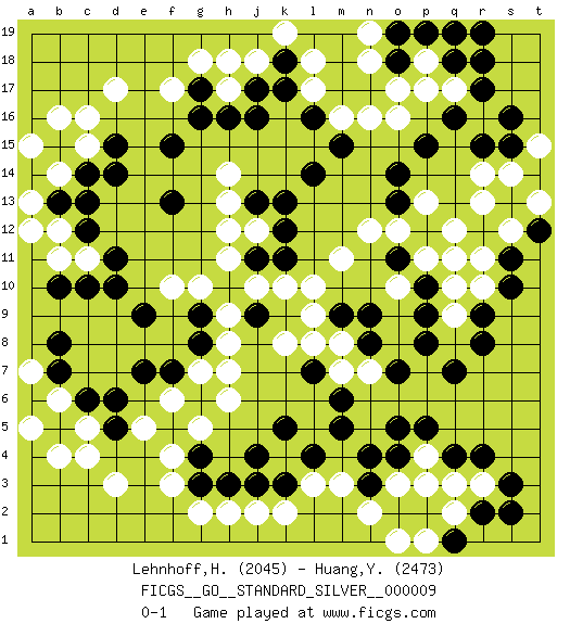Last move : 0-1 2013 May 26 1:45:57 [Event "FICGS__GO__STANDARD_SILVER__000009"] [Site "FICGS"] [Date "2012.10.01"] [Round "1"] [Black "Lehnhoff,Heinz-Georg"] [White "Huang,Yen-Wei"] [Result "0-1"] [Rating 1 "2045"] [Rating 2 "2473"] 1.q16 d17 2.q4 d3 3.d15 c15 4.c14 c16 5.d5 c5 6.c6 c4 7.d6 f3 8.d14 f17 9.d10 r10 10.r8 r14 11.s15 o16 12.n3 q17 13.r17 p17 14.r18 l17 15.s13 r13 16.r12 s14 17.r15 s12 18.s11 r11 19.t12 q12 20.s10 s12 21.r9 t13 22.j16 r3 23.r4 q3 24.s3 o3 25.o4 p4 26.p5 p3 27.o5 n2 28.b15 b16 29.f15 g10 30.s2 m3 31.n4 l3 32.j4 j10 33.b5 b4 34.k5 b14 35.b13 a15 36.g16 b12 37.c13 a13 38.m5 l10 39.l14 j2 40.k18 l18 41.o14 j18 42.o11 h8 43.k17 k19 44.l16 m16 45.m15 n16 46.p10 q10 47.c12 b11 48.g6 k8 49.j9 g7 50.f7 h6 51.g8 h7 52.g9 h9 53.f5 g5 54.g4 f6 55.e7 f4 56.b10 c11 57.c10 q9 58.q7 f10 59.d11 a12 60.e9 b6 61.b7 a5 62.g17 g18 63.h3 e5 64.p9 h2 65.k3 k2 66.o19 q19 67.q18 p18 68.p19 n19 69.o18 n18 70.r19 h17 71.h16 h12 72.j17 h18 73.p15 p13 74.o13 m8 75.l4 t15 76.s16 o1 77.k12 j12 78.k13 h14 79.k11 k10 80.j11 h11 81.f13 a7 82.b8 m11 83.q1 p1 84.r2 q2 85.p12 q11 86.n9 n7 87.m9 l9 88.l7 l8 89.m6 n12 90.g3 g2 91.j3 o12 92.p8 o17 93.o7 p11 94.q19 o10 95.n8 m7 96.j13 h13 0-1 Here are the names of the openings (joseki) played in the four corners : Corner d16 : d17 d15 Komoku (Somok, Xiao~mu`) 3-4 Point. The komoku (3-4) point is the traditional corner enclosure move.. Ikken Takagakari (Hankan Nop'dakeolch'im, Yi Gaogua`jiao~, 1-Space High Approach). The 5-4 approach move has become more popular in modern times, as modern Go emphasizes speed and influence. Corner d4 : d3 d5 Komoku (Somok, Xiao~mu`) 3-4 Point. The komoku (3-4) point is the traditional corner enclosure move.. Ikken Takagakari (Hankan Nop'dakeolch'im, Yi Gaogua`jiao~, 1-Space High Approach). The 5-4 approach move has become more popular in modern times, as modern Go emphasizes speed and influence. Corner q16 : q16 r14 Hoshi (Hwajeom, Seongjeom, Xingwei`) 4-4 Point. The star or hoshi (4-4) point, emphasizing influence at the potential expense of territory. Ikken Kakari (Hankan Keolch'im, Yi Gua`jiao~, 1-Space Low Approach). White 2 is the standard approach move to the 4-4. Player White won this Go (weiqi, baduk) game. Follow this game move after move (download)Win the early ko to win the game. (Anonymous) The obstacle is the path. (Zen proverb)
