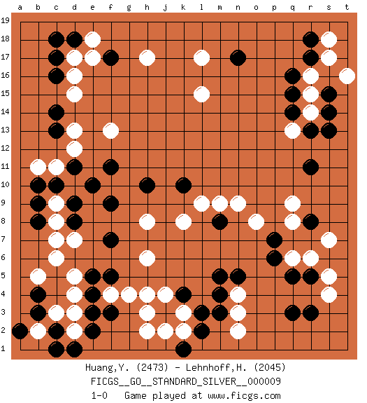Last move : 1-0 2013 March 8 0:13:19 [Event "FICGS__GO__STANDARD_SILVER__000009"] [Site "FICGS"] [Date "2012.10.01"] [Round "2"] [Black "Huang,Yen-Wei"] [White "Lehnhoff,Heinz-Georg"] [Result "1-0"] [Rating 1 "2473"] [Rating 2 "2045"] 1.q16 d4 2.q3 d16 3.f3 c6 4.k4 r6 5.q5 s4 6.r8 q6 7.r5 s5 8.r3 s7 9.p6 q8 10.p7 q9 11.f5 d2 12.f17 h17 13.c17 d17 14.c16 d15 15.d18 e18 16.c18 e17 17.c14 d13 18.c13 n4 19.m5 h4 20.e2 h6 21.c2 d3 22.d1 h2 23.j3 h3 24.b4 d7 25.f7 h8 26.f9 d10 27.h10 k8 28.k10 f4 29.e4 g4 30.e3 d5 31.e5 o8 32.m8 l9 33.r11 n9 34.m4 r14 35.q14 m9 36.r13 r15 37.q15 q13 38.s13 r16 39.r17 c3 40.b3 b2 41.c1 l17 42.n17 l15 43.f11 f13 44.b10 b5 45.a2 s17 46.r18 n3 47.m3 k2 48.l2 k3 49.l3 j4 50.k1 j2 51.b8 c11 52.d9 c9 53.c10 c8 54.b9 s18 55.s14 t16 56.s15 b11 57.d8 c7 58.d11 d12 59.e10 n2 60.n5 1-0 Here are the names of the openings (joseki) played in the four corners : Corner d4 : d4 f3 Hoshi (Hwajeom, Seongjeom, Xingwei`) 4-4 Point. The star or hoshi (4-4) point, emphasizing influence at the potential expense of territory. Ikken Kakari (Hankan Keolch'im, Yi Gua`jiao~, 1-Space Low Approach). Black 2 is the standard approach move to the 4-4. Corner q4 : q3 r6 Komoku (Somok, Xiao~mu`) 3-4 Point. The komoku (3-4) point is the traditional corner enclosure move.. Niken Kakari (Dukan Keolch'im, E`r Gua`jiao~, 2-Space Low Approach). White 2 is used with friendly forces backing it up. Its purpose is to prevent a pincer. Locally it results in a loss, but may be appropriate fuseki strategy. It was popular in the late 1950s and early 1960s, but is not seen often nowadays, having been replaced by the one-space high approach, with which it has points in common. Corner d16 : d16 f17 Hoshi (Hwajeom, Seongjeom, Xingwei`) 4-4 Point. The star or hoshi (4-4) point, emphasizing influence at the potential expense of territory. Ikken Kakari (Hankan Keolch'im, Yi Gua`jiao~, 1-Space Low Approach). Black 2 is the standard approach move to the 4-4. Player Black won this Go (weiqi, baduk) game. Follow this game move after move (download)When your opponent is thick, you must also become thick. (Otake Hideo, 9p) Memory is a way of holding onto the things you love, the things you are, the things you never want to lose. (from the television show: The Wonder Years)