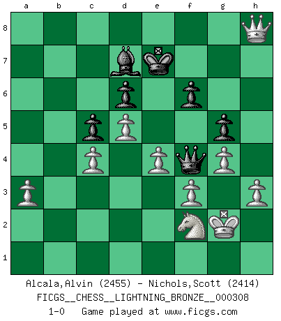 Last move : 1-0 2012 October 1 21:6:59 [Event "FICGS__CHESS__LIGHTNING_BRONZE__000308"] [Site "FICGS"] [Date "2012.10.01"] [Round "1"] [White "Alcala,Alvin"] [Black "Nichols,Scott"] [Result "1-0"] [WhiteElo "2455"] [BlackElo "2414"] 1.c4 Nf6 2.Nc3 g6 3.d4 Bg7 4.e4 d6 5.f3 O-O 6.Be3 c5 7.Nge2 Nc6 8.d5 Ne5 9.Ng3 e6 10.Be2 exd5 11.cxd5 h5 12.O-O Nh7 13.Qd2 h4 14.Nh1 h3 15.g4 Bd7 16.Nf2 b5 17.Kh1 Qh4 18.Rg1 Nc4 19.Bxc4 bxc4 20.Rg3 Rfb8 21.Rxh3 Qe7 22.Nfd1 Rb4 23.Rg3 Rab8 24.Rc1 g5 25.Rc2 Be5 26.Rg2 Qf6 27.Rf2 a6 28.Rf1 Qe7 29.Qf2 Bh8 30.Bc1 Bd4 31.Qe2 Nf8 32.Ne3 Ng6 33.Nxc4 f6 34.b3 Ne5 35.Kg2 Nxc4 36.bxc4 Qg7 37.Bd2 Be5 38.Be1 Kh7 39.Qd3 Rh8 40.Ne2 Kg8 41.Rh1 Rb8 42.Bc3 Qe7 43.h3 Kf7 44.R2c1 Bxc3 45.Qxc3 Qe5 46.Rb1 Ke7 47.Qc2 Kf7 48.a3 a5 49.Nc3 Ke7 50.Ne2 Kf7 51.Qd3 a4 52.Qc2 Ke7 53.Rxb8 Rxb8 54.Rb1 Rxb1 55.Qxb1 Kf8 56.Qc1 Ke8 57.Qc3 Qe7 58.Ng3 Bc8 59.Qa5 Qe5 60.Qxa4+ Bd7 61.Qa8+ Ke7 62.Nh1 Qc3 63.Qg8 Qe5 64.Nf2 Qf4 65.Qh8 1-0 English Opening Kingside Castling by player Black (move 5) Kingside Castling by player White (move 12) Player White won this chess game. Follow this game move after move (download)Though most people love to look at the games of the great attacking masters, some of the most successful players in history have been the quiet positional players. They slowly grind you down by taking away your space, tying up your pieces, and leaving you with virtually nothing to do ! (Yasser Seirawan) Nicht daß Diemer aus Opportunismus Mitglied der NSDAP geworden wäre. Er war ein Fanatiker, in allem, was er tat. (Hans Ree) El Ajedrez es un invernadero donde los frutos del carácter pueden madurar mas completamente que en la vida. (Edward Morgan Foster) Aux échecs, l'amour-propre est satisfait quand on remporte la victoire, mais il n'y a pas de honte à être battu. (Benjamin Franklin) Warrior pose battles inner weakness and wins focus. You see that there is no war within you. You're on your own side, and you are your own strength. (Terri Guillemets)
