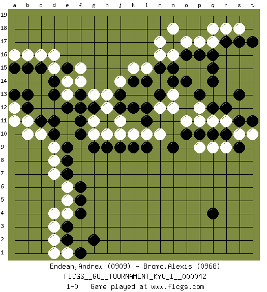 Last move : 1-0 2012 October 11 20:52:4 [Event "FICGS__GO__TOURNAMENT_KYU_I__000042"] [Site "FICGS"] [Date "2012.10.02"] [Round "1"] [Black "Endean,Andrew"] [White "Bromo,Alexis"] [Result "1-0"] [Rating 1 "0909"] [Rating 2 "0968"] 1.q4 d16 2.q16 d4 3.f4 e4 4.e3 d3 5.e2 d2 6.f5 e5 7.e7 e6 8.f6 d7 9.e8 d8 10.d14 d15 11.e12 e14 12.d13 e13 13.d11 f12 14.e9 d9 15.d10 c10 16.c11 b11 17.b12 b10 18.c15 c16 19.b15 b16 20.a15 a16 21.b13 a12 22.a13 a11 23.f11 g11 24.f10 g10 25.e15 f15 26.f13 f14 27.g12 g13 28.f12 h12 29.g9 h10 30.j12 h13 31.h9 j10 32.j9 k10 33.k9 l10 34.l9 m10 35.j13 j14 36.k14 k15 37.l14 l15 38.m15 m16 39.n15 n16 40.o16 o17 41.p16 p17 42.l12 m12 43.m13 n13 44.n14 n12 45.n17 m17 46.l11 j11 47.k12 o15 48.o14 p15 49.q15 p14 50.p13 p12 51.q14 n18 52.q12 q11 53.r12 r11 54.s11 s10 55.t11 t10 56.s13 e1 57.f1 d1 58.g2 q17 59.r17 r18 60.s17 s18 61.t17 q18 62.r10 r9 63.q10 p11 64.s9 q9 65.p10 p9 66.o10 o11 67.n9 1-0 Here are the names of the openings (joseki) played in the four corners : Corner d4 : d4 f4 Hoshi (Hwajeom, Seongjeom, Xingwei`) 4-4 Point. The star or hoshi (4-4) point, emphasizing influence at the potential expense of territory. Ikken Takagakari (Hankan Nop'dakeolch'im, Yi Gaojia, 1-Space High Approach). White typically responds at 6-4 or 3-10. White 4-10 is played when White finds play on the right side advantageous. White 4-8 or 3-8 may be played when White has support at top. Corner d16 : d16 d14 Hoshi (Hwajeom, Seongjeom, Xingwei`) 4-4 Point. The star or hoshi (4-4) point, emphasizing influence at the potential expense of territory. Ikken Takagakari (Hankan Nop'dakeolch'im, Yi Gaojia, 1-Space High Approach). White typically responds at 6-4 or 3-10. White 4-10 is played when White finds play on the right side advantageous. White 4-8 or 3-8 may be played when White has support at top. Player Black won this Go (weiqi, baduk) game. Follow this game move after move (download)To emphasize the lack of determination in his moves, one speaks of chance. (Pierre Audouard) The Internet is the first thing that humanity has build that humanity doesn't understand, the largest experiment in anarchy that we have ever had. (Eric Schmidt)