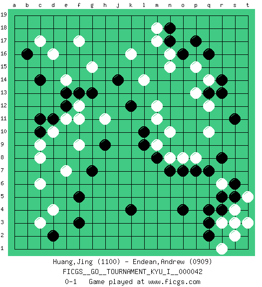 Last move : 0-1 2013 January 3 23:32:47 [Event "FICGS__GO__TOURNAMENT_KYU_I__000042"] [Site "FICGS"] [Date "2012.10.02"] [Round "1"] [Black "Huang,Jing"] [White "Endean,Andrew"] [Result "0-1"] [Rating 1 "1100"] [Rating 2 "0909"] 1.q16 d16 2.q4 d4 3.f3 c6 4.k4 q10 5.r13 r6 6.o4 k16 7.c14 f17 8.b16 c17 9.c11 c8 10.p17 m17 11.r8 p8 12.q7 r3 13.r4 s4 14.s5 s2 15.t4 s3 16.s6 t3 17.q2 t5 18.r5 r1 19.q3 n10 20.l10 m12 21.k12 l14 22.j14 g15 23.g13 e14 24.d2 c3 25.f5 e7 26.g7 f9 27.h9 d10 28.c10 c9 29.d11 e11 30.e12 f11 31.e13 f12 32.f13 h11 33.m8 p13 34.p7 o8 35.o7 n8 36.n7 m9 37.l9 m11 38.n18 m18 39.n17 n16 40.o16 n15 41.q13 q12 42.s11 q14 43.r14 p15 0-1 This go game has been lost on time (started : 2012.10.02 8:53:4) Here are the names of the openings (joseki) played in the four corners : Corner d4 : d4 f3 Hoshi (Hwajeom, Seongjeom, Xingwei`) 4-4 Point. The star or hoshi (4-4) point, emphasizing influence at the potential expense of territory. Ikken Kakari (Hankan Keolch'im, Yi Gua`jiao~, 1-Space Low Approach). Black 2 is the standard approach move to the 4-4. Corner q4 : q4 r6 Hoshi (Hwajeom, Seongjeom, Xingwei`) 4-4 Point. The star or hoshi (4-4) point, emphasizing influence at the potential expense of territory. Ikken Kakari (Hankan Keolch'im, Yi Gua`jiao~, 1-Space Low Approach). White 2 is the standard approach move to the 4-4. Corner d16 : d16 c14 Hoshi (Hwajeom, Seongjeom, Xingwei`) 4-4 Point. The star or hoshi (4-4) point, emphasizing influence at the potential expense of territory. Ikken Kakari (Hankan Keolch'im, Yi Gua`jiao~, 1-Space Low Approach). Black 2 is the standard approach move to the 4-4. Player White won this Go (weiqi, baduk) game. Follow this game move after move (download)There is death in the hane. (Anonymous) It is not true that people stop pursuing dreams because they grow old, they grow old because they stop pursuing dreams. (Gabriel Garcia Marquez)