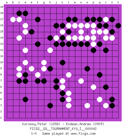 Last move : 1-0 2012 November 14 19:30:58 [Event "FICGS__GO__TOURNAMENT_KYU_I__000042"] [Site "FICGS"] [Date "2012.10.02"] [Round "1"] [Black "Korossy,Peter"] [White "Endean,Andrew"] [Result "1-0"] [Rating 1 "1258"] [Rating 2 "0909"] 1.q16 d16 2.d4 q4 3.r6 o3 4.s4 r3 5.s3 l3 6.h3 p6 7.q8 n7 8.f17 c14 9.j16 d10 10.k10 g10 11.h9 g9 12.d8 c8 13.c7 c9 14.d7 r14 15.r12 p14 16.o17 r17 17.r16 s16 18.s15 r15 19.s17 p15 20.p17 s14 21.t16 q15 22.p12 n14 23.m13 m14 24.l13 l14 25.h14 n16 26.m17 m16 27.l17 l16 28.k16 o16 29.o13 o14 30.o9 l8 31.k5 l5 32.k4 l4 33.g7 f8 34.f7 e9 35.j7 k6 36.j6 k7 37.d18 c17 38.c18 b17 39.f13 d12 40.e15 d15 41.q13 p16 42.q17 k15 43.k14 n15 44.l15 j14 45.k13 p13 46.n13 h12 47.j13 1-0 Here are the names of the openings (joseki) played in the four corners : Corner q4 : q4 r6 Hoshi (Hwajeom, Seongjeom, Xingwei`) 4-4 Point. The star or hoshi (4-4) point, emphasizing influence at the potential expense of territory. Ikken Kakari (Hankan Keolch'im, Yi Gua`jiao~, 1-Space Low Approach). Black 2 is the standard approach move to the 4-4. Corner d16 : d16 f17 Hoshi (Hwajeom, Seongjeom, Xingwei`) 4-4 Point. The star or hoshi (4-4) point, emphasizing influence at the potential expense of territory. Ikken Kakari (Hankan Keolch'im, Yi Gua`jiao~, 1-Space Low Approach). Black 2 is the standard approach move to the 4-4. Corner q16 : q16 r14 Hoshi (Hwajeom, Seongjeom, Xingwei`) 4-4 Point. The star or hoshi (4-4) point, emphasizing influence at the potential expense of territory. Ikken Kakari (Hankan Keolch'im, Yi Gua`jiao~, 1-Space Low Approach). White 2 is the standard approach move to the 4-4. Player Black won this Go (weiqi, baduk) game. Follow this game move after move (download)There are players who don't accept exchange: they play many moves that perpetuate a previous state of the game. (Pierre Audouard) Over-the-board chess is the favorite of mortals, correspondence chess is the favorite of the gods. (Eduard Dyckhoff)