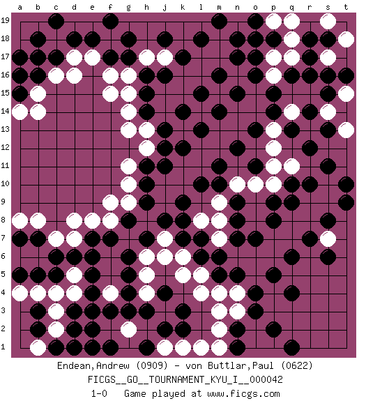 Last move : 1-0 2013 April 19 7:47:28 [Event "FICGS__GO__TOURNAMENT_KYU_I__000042"] [Site "FICGS"] [Date "2012.10.02"] [Round "1"] [Black "Endean,Andrew"] [White "von Buttlar,Paul"] [Result "1-0"] [Rating 1 "0909"] [Rating 2 "0622"] 1.q4 d4 2.q16 d16 3.f17 f15 4.h16 g16 5.g17 g15 6.h15 g14 7.h14 h13 8.j13 g13 9.j12 h12 10.h11 g11 11.h10 g10 12.h9 g9 13.f3 h8 14.j8 j9 15.k9 j10 16.j11 k10 17.l10 k11 18.k12 l11 19.m11 l12 20.l13 m12 21.n12 m13 22.m14 n13 23.o13 n14 24.n15 o14 25.p14 o15 26.o16 p16 27.p15 p17 28.o17 q17 29.r16 j14 30.k14 j15 31.j16 k15 32.l15 k16 33.k17 l16 34.m16 l17 35.l18 j7 36.k7 e17 37.e18 m17 38.n17 m18 39.m19 j17 40.n18 f16 41.c6 f18 42.g18 l8 43.h7 j6 44.g8 f8 45.f7 h6 46.g6 k6 47.l7 m7 48.l6 l5 49.m6 n6 50.m5 m4 51.n5 k5 52.n7 m8 53.k8 o6 54.n8 m9 55.n9 n10 56.m10 o10 57.p9 e8 58.e7 d7 59.d6 b6 60.e5 d8 61.o7 o5 62.o4 n4 63.p5 p6 64.q6 p7 65.p8 q7 66.r7 q8 67.q9 r8 68.s8 r9 69.r10 s9 70.t9 s10 71.s11 p10 72.q10 p11 73.t10 c7 74.b5 a6 75.a5 c4 76.c5 d5 77.e4 b4 78.d3 c3 79.d2 c2 80.c1 a4 81.e6 b1 82.d1 e1 83.e2 f2 84.f1 g2 85.b2 e19 86.f19 d19 87.d18 d17 88.c17 c16 89.b17 c18 90.c19 f9 91.b7 b8 92.a7 a8 93.b16 b15 94.a15 a14 95.b18 a16 96.a17 p12 97.q13 o18 98.p18 q18 99.o19 q19 100.r17 p19 101.o18 s19 102.r18 f4 103.g3 h2 104.h3 g1 105.e3 e1 106.b3 j3 107.g4 h5 108.g5 h4 109.a15 b14 110.a16 h17 111.j18 n3 112.o3 o2 113.p2 p1 114.q1 o1 115.n2 m2 116.n1 l4 117.f1 m1 118.e1 m3 119.j2 j1 120.h1 k1 121.k2 l1 122.k3 g2 123.j4 s17 124.s18 t18 125.s16 q11 126.r12 p13 127.o11 q14 128.r14 t15 129.t16 s7 130.s6 s14 131.s13 t13 132.s15 1-0 Here are the names of the openings (joseki) played in the four corners : Corner d16 : d16 f17 Hoshi (Hwajeom, Seongjeom, Xingwei`) 4-4 Point. The star or hoshi (4-4) point, emphasizing influence at the potential expense of territory. Ikken Kakari (Hankan Keolch'im, Yi Gua`jiao~, 1-Space Low Approach). Black 2 is the standard approach move to the 4-4. Corner d4 : d4 h9 Hoshi (Hwajeom, Seongjeom, Xingwei`) 4-4 Point. The star or hoshi (4-4) point, emphasizing influence at the potential expense of territory. Corner q16 : q16 l11 Hoshi (Hwajeom, Seongjeom, Xingwei`) 4-4 Point. The star or hoshi (4-4) point, emphasizing influence at the potential expense of territory. Corner q4 : q4 l8 Hoshi (Hwajeom, Seongjeom, Xingwei`) 4-4 Point. The star or hoshi (4-4) point, emphasizing influence at the potential expense of territory. Player Black won this Go (weiqi, baduk) game. Follow this game move after move (download)Don't make a play adjacent to a cutting-point. (Anonymous) A cynic is a man who knows the price of everything but the value of nothing. (Oscar Wilde)