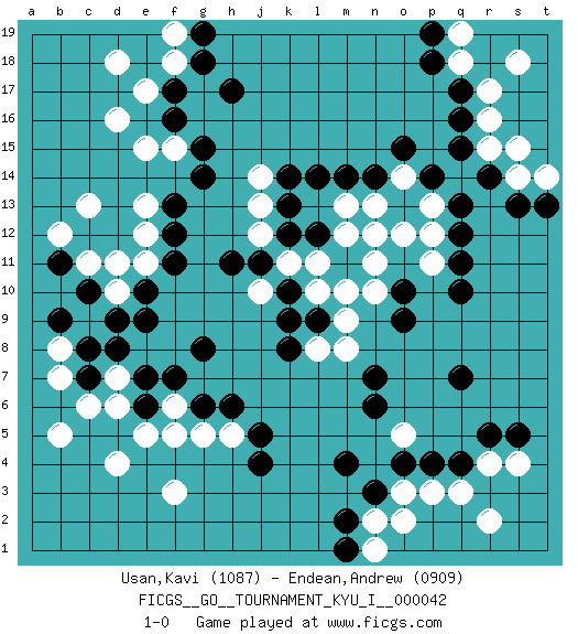 Last move : 1-0 2012 November 12 9:17:36 [Event "FICGS__GO__TOURNAMENT_KYU_I__000042"] [Site "FICGS"] [Date "2012.10.02"] [Round "1"] [Black "Usan,Kavi"] [White "Endean,Andrew"] [Result "1-0"] [Rating 1 "1087"] [Rating 2 "0909"] 1.q16 d4 2.q4 d16 3.q10 o3 4.m4 o5 5.j4 f3 6.q7 q3 7.p4 p3 8.o4 r4 9.r5 s4 10.n3 n2 11.m2 n1 12.s5 r2 13.m1 o2 14.c10 c13 15.c7 c6 16.e7 b7 17.c8 b8 18.b9 d6 19.e6 d7 20.d8 e5 21.g6 g5 22.h6 h5 23.j5 f6 24.f7 f5 25.g8 b5 26.f17 e17 27.f16 f18 28.g18 f19 29.g19 d18 30.h17 r17 31.q17 r16 32.q15 r15 33.r14 q18 34.p18 q19 35.p19 s18 36.k12 j12 37.k13 j13 38.k14 j14 39.f13 f15 40.g15 e15 41.g14 e13 42.f12 e12 43.f11 e11 44.e10 d11 45.n7 k11 46.j11 j10 47.h11 l11 48.k10 l10 49.k9 n10 50.o9 n12 51.m14 m13 52.n14 p11 53.l12 m12 54.l14 p13 55.q12 p12 56.o13 o12 57.q13 s14 58.s13 t14 59.t13 s15 60.p14 n13 61.l9 m9 62.m11 m10 63.o10 o14 64.o15 n11 65.q11 l8 66.k8 m8 67.n6 d10 68.d9 c11 69.b11 b12 70.e9 1-0 Here are the names of the openings (joseki) played in the four corners : Corner q4 : q4 o3 Hoshi (Hwajeom, Seongjeom, Xingwei`) 4-4 Point. The star or hoshi (4-4) point, emphasizing influence at the potential expense of territory. Ikken Kakari (Hankan Keolch'im, Yi Gua`jiao~, 1-Space Low Approach). White 2 is the standard approach move to the 4-4. Corner d4 : d4 j4 Hoshi (Hwajeom, Seongjeom, Xingwei`) 4-4 Point. The star or hoshi (4-4) point, emphasizing influence at the potential expense of territory. Corner q16 : q16 r17 Hoshi (Hwajeom, Seongjeom, Xingwei`) 4-4 Point. The star or hoshi (4-4) point, emphasizing influence at the potential expense of territory. Player Black won this Go (weiqi, baduk) game. Follow this game move after move (download)Each step in a ladder is worth 7 points. (Anonymous) Experiences are the keys to life. (Daniel Parmet)