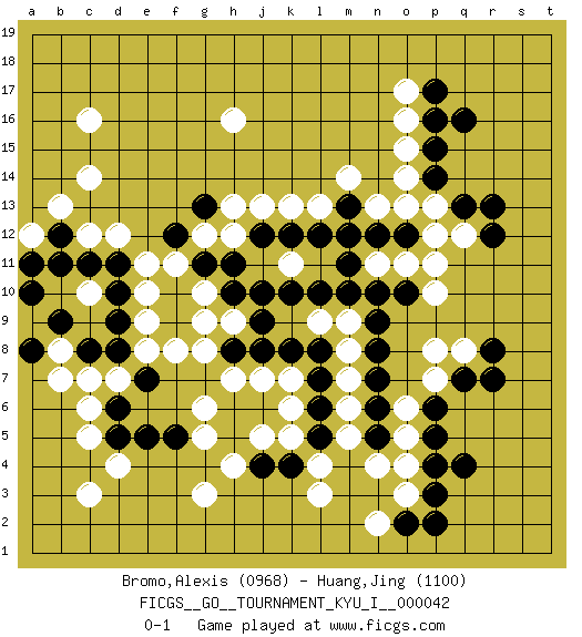 Last move : 0-1 2013 February 2 12:46:26 [Event "FICGS__GO__TOURNAMENT_KYU_I__000042"] [Site "FICGS"] [Date "2012.10.02"] [Round "1"] [Black "Bromo,Alexis"] [White "Huang,Jing"] [Result "0-1"] [Rating 1 "0968"] [Rating 2 "1100"] 1.q16 d4 2.q4 c16 3.d10 o17 4.p17 o16 5.p16 o15 6.p15 o14 7.p14 p13 8.q13 q12 9.r13 p12 10.r12 h16 11.k10 d12 12.k4 g3 13.h5 o3 14.p3 o4 15.p4 o5 16.p5 o6 17.p6 p7 18.q7 q8 19.r7 p8 20.r8 k6 21.e7 g6 22.f5 g5 23.h6 h4 24.j4 j5 25.j6 k5 26.l5 l4 27.l6 k7 28.l7 h7 29.k8 j7 30.j8 l3 31.h8 g8 32.g9 f8 33.f9 e8 34.d8 e9 35.d9 e10 36.f10 e11 37.d11 c12 38.c11 d7 39.d6 c7 40.c8 c6 41.d5 c5 42.e5 c3 43.b12 b13 44.b11 c14 45.f12 f11 46.g11 g12 47.g13 h12 48.h11 h13 49.j12 j13 50.k12 h9 51.h10 g10 52.j9 g9 53.j10 k13 54.l12 l13 55.m12 n13 56.n12 m8 57.l8 m9 58.m10 l9 59.l10 n11 60.m11 k11 61.n10 o11 62.o12 p10 63.o10 p11 64.n8 m7 65.n7 m6 66.n6 m5 67.n5 n4 68.n9 o13 69.m13 m14 70.o2 n2 71.p2 b8 72.b9 b7 73.a8 a12 74.a11 a9 75.a10 c10 0-1 Here are the names of the openings (joseki) played in the four corners : Corner q16 : q16 o17 Hoshi (Hwajeom, Seongjeom, Xingwei`) 4-4 Point. The star or hoshi (4-4) point, emphasizing influence at the potential expense of territory. Ikken Kakari (Hankan Keolch'im, Yi Gua`jiao~, 1-Space Low Approach). White 2 is the standard approach move to the 4-4. Corner q4 : q4 o3 Hoshi (Hwajeom, Seongjeom, Xingwei`) 4-4 Point. The star or hoshi (4-4) point, emphasizing influence at the potential expense of territory. Ikken Kakari (Hankan Keolch'im, Yi Gua`jiao~, 1-Space Low Approach). White 2 is the standard approach move to the 4-4. Player White won this Go (weiqi, baduk) game. Follow this game move after move (download)The weak player fears ko, the strong player seeks it. (Bill Taylor) Computers are like Old Testament gods; lots of rules and no mercy. (Joseph Campbell)