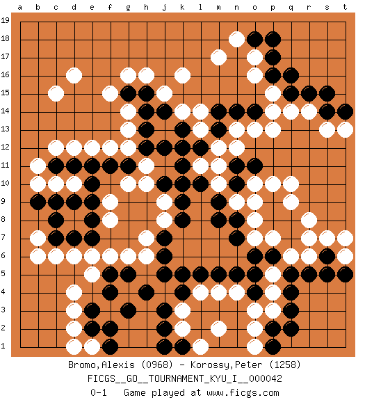 Last move : 0-1 2012 December 1 13:47:10 [Event "FICGS__GO__TOURNAMENT_KYU_I__000042"] [Site "FICGS"] [Date "2012.10.02"] [Round "1"] [Black "Bromo,Alexis"] [White "Korossy,Peter"] [Result "0-1"] [Rating 1 "0968"] [Rating 2 "1258"] 1.q16 d4 2.q4 d16 3.k10 r6 4.r5 q6 5.q5 q10 6.p6 n4 7.k4 p5 8.o5 p4 9.o4 p3 10.q3 o3 11.n5 m4 12.m5 l4 13.l5 k3 14.j3 k2 15.j2 j4 16.k5 m2 17.s6 s7 18.s5 r8 19.q7 r7 20.q8 q9 21.p8 r14 22.r15 q14 23.q15 o17 24.p17 o16 25.p16 k16 26.h4 d10 27.j5 f3 28.g3 j8 29.k8 j9 30.k9 h6 31.j6 g6 32.g5 f6 33.f5 e5 34.f4 n9 35.p9 p10 36.o9 o10 37.n10 o8 38.n8 p7 39.o6 m10 40.n11 m11 41.m9 o9 42.m8 p15 43.s14 s13 44.t14 t13 45.s15 p14 46.l10 l11 47.k11 l13 48.l12 m12 49.k12 h11 50.j10 h10 51.m13 n12 52.o11 n13 53.m14 k14 54.k13 l14 55.n14 o13 56.o14 p13 57.j14 j15 58.h14 g16 59.h15 h16 60.o18 n18 61.p18 m17 62.j7 h7 63.e3 d3 64.f2 g12 65.h12 g13 66.h13 g14 67.g15 f15 68.j12 c15 69.p2 o2 70.q2 d2 71.e2 e1 72.f1 d1 73.k1 l1 74.j1 o7 75.n7 o1 76.p1 t6 77.t5 t7 78.c8 c6 79.c9 c10 80.c7 b6 81.d7 d6 82.e7 e6 83.d9 f8 84.e8 f9 85.e10 b10 86.b9 b7 87.e9 d12 88.e11 e12 89.g11 g10 90.f11 f12 91.d11 c12 92.c11 b11 0-1 Here are the names of the openings (joseki) played in the four corners : Corner q4 : q4 r6 Hoshi (Hwajeom, Seongjeom, Xingwei`) 4-4 Point. The star or hoshi (4-4) point, emphasizing influence at the potential expense of territory. Ikken Kakari (Hankan Keolch'im, Yi Gua`jiao~, 1-Space Low Approach). White 2 is the standard approach move to the 4-4. Corner d4 : d4 j3 Hoshi (Hwajeom, Seongjeom, Xingwei`) 4-4 Point. The star or hoshi (4-4) point, emphasizing influence at the potential expense of territory. Corner q16 : q16 r14 Hoshi (Hwajeom, Seongjeom, Xingwei`) 4-4 Point. The star or hoshi (4-4) point, emphasizing influence at the potential expense of territory. Ikken Kakari (Hankan Keolch'im, Yi Gua`jiao~, 1-Space Low Approach). White 2 is the standard approach move to the 4-4. Player White won this Go (weiqi, baduk) game. Follow this game move after move (download)Studying go is a wonderful way to develop both the creative as well as the logical abilities of children because to play it both sides of the brain are necessary. (Cho Chikun) I don't believe in psychology. I believe in good moves. (Bobby Fischer)