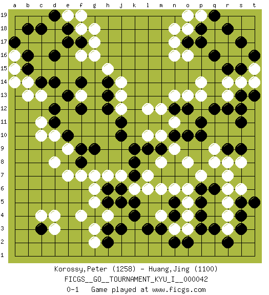 Last move : 0-1 2013 April 20 10:51:32 [Event "FICGS__GO__TOURNAMENT_KYU_I__000042"] [Site "FICGS"] [Date "2012.10.02"] [Round "1"] [Black "Korossy,Peter"] [White "Huang,Jing"] [Result "0-1"] [Rating 1 "1258"] [Rating 2 "1100"] 1.q16 d4 2.d16 r4 3.p3 m4 4.p5 r7 5.r2 r14 6.r12 p14 7.r9 o16 8.o17 n17 9.p17 n16 10.s15 s14 11.r15 o13 12.p10 q8 13.p11 o8 14.n10 l10 15.s13 t15 16.t16 t14 17.s17 r13 18.s12 f16 19.f17 g17 20.e17 g16 21.c14 c10 22.e10 d8 23.j10 l12 24.l9 m10 25.m9 n9 26.k9 n11 27.o10 o6 28.k4 o4 29.p4 m6 30.n2 s8 31.s9 r8 32.s11 k6 33.j6 j7 34.k7 l7 35.k8 h7 36.k5 l6 37.h6 g7 38.l3 h4 39.g4 g3 40.h3 g5 41.h5 f4 42.h13 f13 43.f12 j14 44.h14 h15 45.e13 j13 46.h12 b13 47.c3 c4 48.s5 r5 49.s4 s6 50.s3 m8 51.g9 b14 52.b15 d3 53.h2 g2 54.j3 g6 55.j5 c13 56.d14 d10 57.n12 m12 58.o12 n13 59.n5 o5 60.n4 n3 61.m3 o3 62.o2 n6 63.t13 f18 64.e18 g18 65.f14 o18 66.p18 n18 67.p6 p7 68.q6 r6 69.q12 p13 70.f8 e7 71.d11 c11 72.d12 a15 73.b16 e19 74.d19 f19 75.c18 p19 76.q19 o19 77.r18 r3 78.q3 a16 79.a17 a14 80.b18 j12 81.j11 e9 82.f9 f7 83.t5 q9 0-1 Here are the names of the openings (joseki) played in the four corners : Corner q4 : r4 p3 Komoku (Somok, Xiao~mu`) 3-4 Point. The komoku (3-4) point is the traditional corner enclosure move.. Ikken Kakari (Hankan Keolch'im, Yi Gua`jiao~, 1-Space Low Pincer). The small knight move is the basic approach move to the 3-4 point stone. It has been continually used for over four centuries. There are limitless variations, with new moves constantly being discovered. Black 2 opens the door to a treaure store of joseki. Corner q16 : q16 r14 Hoshi (Hwajeom, Seongjeom, Xingwei`) 4-4 Point. The star or hoshi (4-4) point, emphasizing influence at the potential expense of territory. Ikken Kakari (Hankan Keolch'im, Yi Gua`jiao~, 1-Space Low Approach). White 2 is the standard approach move to the 4-4. Corner d16 : d16 f16 Hoshi (Hwajeom, Seongjeom, Xingwei`) 4-4 Point. The star or hoshi (4-4) point, emphasizing influence at the potential expense of territory. Ikken Takagakari (Hankan Nop'dakeolch'im, Yi Gaojia, 1-Space High Approach). Black typically responds at 6-4 or 3-10. Black 4-10 is played when Black finds play on the right side advantageous. Black 4-8 or 3-8 may be played when Black has support at top. Player White won this Go (weiqi, baduk) game. Follow this game move after move (download)Dead group ? Always win ko fights ! (Anonymous) Two beer, or not two beer. (Unknown)