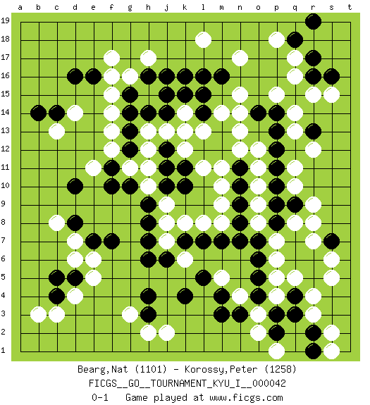 Last move : 0-1 2013 March 31 15:31:3 [Event "FICGS__GO__TOURNAMENT_KYU_I__000042"] [Site "FICGS"] [Date "2012.10.02"] [Round "1"] [Black "Bearg,Nat"] [White "Korossy,Peter"] [Result "0-1"] [Rating 1 "1101"] [Rating 2 "1258"] 1.q4 d4 2.d16 q16 3.k10 f17 4.d10 q10 5.k4 g3 6.k16 d14 7.c14 k14 8.m16 h15 9.h16 g16 10.j16 n17 11.l16 l18 12.g15 f15 13.g14 f14 14.g13 h17 15.j14 j13 16.k15 h10 17.h9 c13 18.b14 e11 19.c4 c3 20.c5 b3 21.r16 r15 22.r17 q17 23.q18 p18 24.r19 s15 25.s16 q13 26.r13 r12 27.q9 r3 28.q3 r4 29.r5 s5 30.r2 s2 31.p2 s1 32.r1 k6 33.j6 j7 34.h6 j9 35.h8 p6 36.q6 p5 37.o7 p7 38.p9 m5 39.m4 n4 40.m3 r8 41.q7 q8 42.p8 q5 43.s7 r9 44.p10 q11 45.p11 n13 46.m12 l13 47.l14 k13 48.j12 h13 49.g12 h12 50.j11 h11 51.j10 j8 52.k7 k8 53.l7 l8 54.m7 m8 55.n7 m10 56.m13 m14 57.l15 n15 58.g10 l11 59.l12 k12 60.h14 n12 61.p12 o3 62.k11 m11 63.l5 g11 64.f11 f12 65.f10 f13 66.j15 o8 67.n8 o9 68.n9 o10 69.n10 o11 70.p13 q14 71.p14 p15 72.r6 s6 73.n11 o12 74.o14 n14 75.e16 f16 76.h7 m9 77.o5 p4 78.p3 o2 79.o4 r7 80.o6 p1 81.n3 j2 82.h3 h2 83.h4 c8 84.d8 d7 85.e7 d6 86.d5 e6 87.f7 e5 0-1 Here are the names of the openings (joseki) played in the four corners : Corner d16 : d16 f17 Hoshi (Hwajeom, Seongjeom, Xingwei`) 4-4 Point. The star or hoshi (4-4) point, emphasizing influence at the potential expense of territory. Ikken Kakari (Hankan Keolch'im, Yi Gua`jiao~, 1-Space Low Approach). White 2 is the standard approach move to the 4-4. Corner q16 : q16 m16 Hoshi (Hwajeom, Seongjeom, Xingwei`) 4-4 Point. The star or hoshi (4-4) point, emphasizing influence at the potential expense of territory. Player White won this Go (weiqi, baduk) game. Follow this game move after move (download)Studying go is a wonderful way to develop both the creative as well as the logical abilities of children because to play it both sides of the brain are necessary. (Cho Chikun) The real danger is not that computers will begin to think like men, but that men will begin to think like computers. (Sydney J. Harris)
