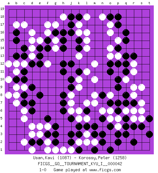 Last move : 1-0 2013 February 2 11:4:5 [Event "FICGS__GO__TOURNAMENT_KYU_I__000042"] [Site "FICGS"] [Date "2012.10.02"] [Round "1"] [Black "Usan,Kavi"] [White "Korossy,Peter"] [Result "1-0"] [Rating 1 "1087"] [Rating 2 "1258"] 1.q16 d16 2.q3 r5 3.q5 q6 4.r4 p5 5.q4 r6 6.p6 o5 7.p7 r8 8.m4 n6 9.p9 q10 10.q8 r9 11.p10 p11 12.q11 r11 13.q12 r12 14.q13 d4 15.f3 f4 16.g4 e3 17.f5 e4 18.g3 c6 19.l6 m7 20.o11 o3 21.p2 o2 22.r2 l3 23.m3 m2 24.l4 k2 25.k3 l2 26.j3 j6 27.j5 l7 28.h6 j7 29.h7 l16 30.c14 c12 31.e14 f17 32.b16 c17 33.c8 d8 34.d9 c9 35.c10 b9 36.d7 b8 37.c7 b7 38.e8 f12 39.d12 o17 40.p17 o16 41.j16 g15 42.g16 f16 43.h15 g17 44.h16 g14 45.h14 k13 46.h12 j11 47.h11 o13 48.o12 p13 49.p12 p15 50.q15 m12 51.f15 b17 52.b15 m10 53.j10 k10 54.j9 k9 55.j12 b11 56.c11 b12 57.k11 l11 58.d6 c5 59.r13 e15 60.f14 d13 61.e13 d14 62.e12 k17 63.j17 k16 64.k18 h18 65.j18 l18 66.o18 n18 67.p18 j8 68.h8 k6 69.n8 m8 70.n3 k5 71.k4 l5 72.n2 n1 73.n5 o6 74.o4 p4 75.p3 n4 76.c13 d15 77.o4 f2 78.o1 g1 79.g2 h1 80.j2 j1 81.e2 f1 82.d2 c2 83.k1 d1 84.m1 d3 85.r7 s7 86.q7 s5 87.s4 t4 88.t3 s9 89.t5 s6 90.p14 o14 91.k14 l14 92.k15 l15 93.b10 a10 94.a9 a8 95.a11 a12 96.b13 o8 97.o7 1-0 Here are the names of the openings (joseki) played in the four corners : Corner q4 : q3 r5 Komoku (Somok, Xiao~mu`) 3-4 Point. The komoku (3-4) point is the traditional corner enclosure move.. Ikken Kakari (Hankan Keolch'im, Yi Gua`jiao~, 1-Space Low Pincer). The small knight move is the basic approach move to the 3-4 point stone. It has been continually used for over four centuries. There are limitless variations, with new moves constantly being discovered. White 2 opens the door to a treaure store of joseki. Corner q16 : q16 p11 Hoshi (Hwajeom, Seongjeom, Xingwei`) 4-4 Point. The star or hoshi (4-4) point, emphasizing influence at the potential expense of territory. Corner d4 : d4 f3 Hoshi (Hwajeom, Seongjeom, Xingwei`) 4-4 Point. The star or hoshi (4-4) point, emphasizing influence at the potential expense of territory. Ikken Kakari (Hankan Keolch'im, Yi Gua`jiao~, 1-Space Low Approach). Black 2 is the standard approach move to the 4-4. Corner d16 : d16 c14 Hoshi (Hwajeom, Seongjeom, Xingwei`) 4-4 Point. The star or hoshi (4-4) point, emphasizing influence at the potential expense of territory. Ikken Kakari (Hankan Keolch'im, Yi Gua`jiao~, 1-Space Low Approach). Black 2 is the standard approach move to the 4-4. Player Black won this Go (weiqi, baduk) game. Follow this game move after move (download)On the second line six die, eight live. (Anonymous) The greatest con, that he ever pulled... was making you believe... that he is you. (Revolver, movie)