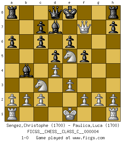 Last move : 1-0 2006 August 14 17:38:4 [Event "FICGS__CHESS__CLASS_C__000004"] [Site "FICGS"] [Date "2006.05.16"] [Round "1"] [White "Sengez,Christophe"] [Black "Paulica,Luca"] [Result "1-0"] [WhiteElo "1700"] [BlackElo "1700"] 1.d4 Nf6 2.Bg5 d5 3.Bxf6 gxf6 4.e3 e6 5.Qh5 Nc6 6.Nc3 f5 7.Bb5 a6 8.Bxc6+ bxc6 9.Nf3 Bb4 10.Ne5 Bd7 11.Qxf7+ 1-0 This chess game has been lost on time (started : 2006.05.16 12:13:29) Trompowsky attack (Ruth, Opovcensky Opening) Player White won this chess game. Follow this game move after move (download)I am the best player in the world and I am here to prove it. (Bobby Fischer) Ich könnte leicht behaupten: Ja,ja, Leonid Breschnew wollte nicht, daß ich Weltmeister werde. In der Tat war die Sache komplizierter. (Viktor Kortschnoi) Diferente gente reacciona diferentemente en aceptar la derrota. (Bobby Fischer) Assurément je connaissais par expérience le mystérieux attrait de ce jeu royal, le seul entre tous les jeux inventés par les hommes qui échappe souverainement à la tyrannie du hasard, le seul où l'on ne doive sa victoire qu'à son intelligence ou plutôt à une certaine forme d'intelligence. Mais n'est-ce pas déjà le limiter injurieusement que d'appeler les échecs un jeu ? N'est-ce pas une science, un art ou quelque chose qui, comme le cercueil de Mahomet entre ciel et terre, est suspendu entre l'un et l'autre, et qui réunit un nombre incroyable de contraires ? [...] C'est une pensée qui ne mène à rien, une mathématique qui n'établit rien, un art qui ne laisse pas d'uvre, une architecture sans matière; et il l'a prouvé néanmoins qu'il était plus durable, à sa manière, que les livres ou que tout autre monument, ce jeu unique qui appartient à tous les peuples et à tous les temps, et dont personne ne sait quel dieu en fit don à la terre pour tuer l'ennui, pour aiguiser l'esprit et stimuler l'âme. Où commence-t-il, où finit-il ? (Stefan Zweig) The Internet is so big, so powerful and pointless that for some people it is a complete substitute for life. (Andrew Brown)