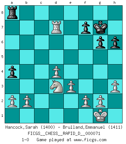 Last move : 1-0 2012 October 23 14:38:48 [Event "FICGS__CHESS__RAPID_D__000071"] [Site "FICGS"] [Date "2012.10.02"] [Round "1"] [White "Hancock,Sarah"] [Black "Brulland,Emmanuel"] [Result "1-0"] [WhiteElo "1400"] [BlackElo "1411"] 1.d4 d5 2.Nf3 Nf6 3.Nc3 e6 4.Bg5 Be7 5.e3 Nbd7 6.Be2 O-O 7.h3 h6 8.Bf4 Re8 9.Nb5 Bd6 10.Bxd6 cxd6 11.Nxd6 Rf8 12.c4 dxc4 13.Nxc4 Nb6 14.Nce5 Nbd7 15.O-O Nxe5 16.Nxe5 Nd7 17.Nd3 Nf6 18.Bf3 a6 19.Qb3 Qd7 20.Rfc1 Rb8 21.Rc6 Nd5 22.Rxa6 bxa6 23.Qxb8 Bb7 24.Nc5 Qc6 25.Qxb7 Qxb7 26.Nxb7 Rb8 27.Nc5 a5 28.Bxd5 exd5 29.Nd3 g6 30.Rc1 Kg7 31.Rc5 a4 32.Rxd5 Ra8 33.Rd7 1-0 Queen's pawn game Kingside Castling by player Black (move 6) Kingside Castling by player White (move 15) Player White won this chess game. Follow this game move after move (download)Bobby Fischer is the greatest Chess genius of all time ! (Alexander Kotov) Die Partien sind immer verschieden, die Interviews immer die gleichen. (Garry Kasparov) El hombre es un frívolo, una creatura engañosa y como un jugador de Ajedrez, se preocupa mas por el proceso de obtener su meta que de la meta por sí misma. (Dostoyevsky) Ce qui caractérise les parties de combat, c'est que si le défenseur a constamment de difficiles problèmes à résoudre, l'attaquant doit chercher sans relâche de nouvelles possibilités d'attaque. (Koblentz) It's unlucky to be superstitious. (Dave Enteles)