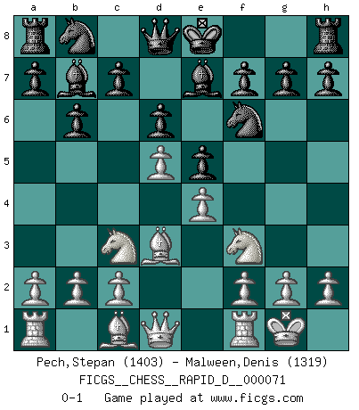 Last move : 0-1 2012 November 23 23:1:38 [Event "FICGS__CHESS__RAPID_D__000071"] [Site "FICGS"] [Date "2012.10.02"] [Round "1"] [White "Pech,Stepan"] [Black "Malween,Denis"] [Result "0-1"] [WhiteElo "1403"] [BlackElo "1319"] 1.d4 b6 2.e4 Bb7 3.Nc3 e6 4.Nf3 d6 5.Bd3 Nf6 6.O-O Be7 7.d5 e5 0-1 This chess game has been lost on time (started : 2012.10.02 8:57:6) Queen's pawn : English defense Kingside Castling by player White (move 6) Player Black won this chess game. Follow this game move after move (download)The older I grow, the more I value pawns. (Paul Keres) Auf jeden Fall musst du zuerst Rechtsanwalt werden, damit du deine eigenen Interessen und die deiner Familie vertreten kannst. [Brief an seinen Sohn] (José Raúl Capablanca) No todos los artistas son jugadores de Ajedrez, pero todos los jugadores de Ajedrez son artistas. (Marcel Duchamp) Un millionnaire : 'Monsieur Steinitz ! Vous ne participez aux tournois que pour l'argent, alors que moi je n'y viens que pour l'honneur.' Steinitz : 'Chacun joue pour ce qu'il n'a pas'... Convictions are more dangerous enemies of truth than lies. (Friedrich Nietzsche)
