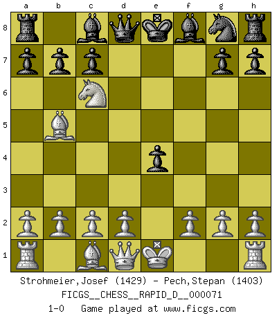 Last move : 1-0 2012 November 23 11:1:22 [Event "FICGS__CHESS__RAPID_D__000071"] [Site "FICGS"] [Date "2012.10.02"] [Round "1"] [White "Strohmeier,Josef"] [Black "Pech,Stepan"] [Result "1-0"] [WhiteElo "1429"] [BlackElo "1403"] 1.e4 e5 2.Nf3 Nc6 3.Bb5 f5 4.Nc3 fxe4 5.Nxe4 d5 6.Nxe5 dxe4 7.Nxc6 1-0 This chess game has been lost on time (started : 2012.10.02 8:57:6) Ruy Lopez : Schliemann defense, Berger variation Player White won this chess game. Follow this game move after move (download)Man is a frivolous, a specious creature, and like a Chess player, cares more for the process of attaining his goal than for the goal itself. (Dostoyevsky) Es macht mich traurig, wenn ich sehe, dass Golfprofis mehr verdienen als Schachsportler. Obwohl ich davon überzeugt bin, dass wir Schachspieler viel härter trainieren müssen als die Golfer. (Alexandra Kosteniuk) El Ajedrez es tan inspirador que yo no creo que un buen jugador sea capaz de tener un pensamiento malo durante una partida. (Wilhelm Steinitz) Le joueur d'Echecs qui veut atteindre le top est obligé de développer son propre credo créatif. Alexeï Stepanovicth Souétine. Il est facile d'écrire des livres ! Ce qui est difficile, c'est de jouer ! (Alexeï Stepanovicth Souétine) Watch your thoughts; they become words. Watch your words; they become actions. Watch your actions; they become habits. Watch your habits; they become character. Watch your character; it becomes your destiny. (Frank Outlaw)