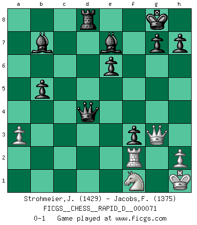 Last move : 0-1 2013 February 12 22:40:39 [Event "FICGS__CHESS__RAPID_D__000071"] [Site "FICGS"] [Date "2012.10.02"] [Round "1"] [White "Strohmeier,Josef"] [Black "Jacobs,Francois"] [Result "0-1"] [WhiteElo "1429"] [BlackElo "1375"] 1.e4 c5 2.Nf3 e6 3.d4 cxd4 4.Nxd4 Nf6 5.Nc3 d6 6.Be2 a6 7.O-O Be7 8.Be3 Qc7 9.Qd2 O-O 10.Rad1 b5 11.a3 Bb7 12.f3 Nbd7 13.Nb3 Rac8 14.Bf4 Ne5 15.Be3 Rfd8 16.Qe1 Nc4 17.Bc1 d5 18.exd5 Nxd5 19.Ne4 Nce3 20.Bxe3 Nxe3 21.Rxd8+ Rxd8 22.Rf2 Qxc2 23.Nbd2 f5 24.Nf1 Nxg2 25.Rxg2 fxe4 26.Qg3 Qxb2 27.Bxb5 Qd4+ 28.Kh1 exf3 29.Rf2 axb5 0-1 Sicilian : Anderssen variation Kingside Castling by player White (move 7) Kingside Castling by player Black (move 9) Player Black won this chess game. Follow this game move after move (download)The most powerful weapon in Chess is to have the next move. (David Bronstein) Warum muß ich gegen diesen IDIOTEN verlieren? (Aaron Nimzowitsch) Si tu oponente te ofrece un empate, trata de averiguar porque piensa él que esta en una posición peor. (Nigel Short) Même si vous avez un bon coup à faire, regardez toujours s'il n'y en a pas un qui lui soit préférable. (Pedro Damiano) For peace of mind, resign as general manager of the universe. (Douglas Adams)