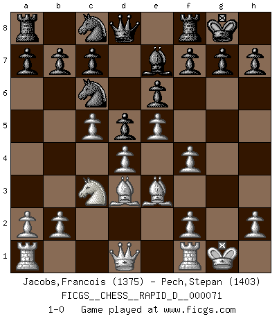Last move : 1-0 2012 December 4 23:21:13 [Event "FICGS__CHESS__RAPID_D__000071"] [Site "FICGS"] [Date "2012.10.02"] [Round "1"] [White "Jacobs,Francois"] [Black "Pech,Stepan"] [Result "1-0"] [WhiteElo "1375"] [BlackElo "1403"] 1.e4 Nf6 2.e5 Nd5 3.d4 d6 4.Nf3 Bg4 5.Be2 e6 6.O-O Be7 7.c4 Nb6 8.Nc3 O-O 9.Be3 d5 10.c5 Bxf3 11.gxf3 Nc8 12.f4 Nc6 13.Bd3 1-0 Alekhine's defense : Modern variation, 4...Bg4 Kingside Castling by player White (move 6) Kingside Castling by player Black (move 8) Player White won this chess game. Follow this game move after move (download)First-class players lose to second class players because second-class players sometimes play a first-class game. (Tarrasch) Wenn man heute mit 14 Jahren noch kein GM ist, kann man es vergessen. (Viswanathan Anand) No existe un remordimiento como el remordimiento del Ajedrez. (H. G. Wells) Les ravages du H expliquent la différence de niveau entre Tal et Thal [Abergel]. Art is the triumph over chaos. (John Cheever)