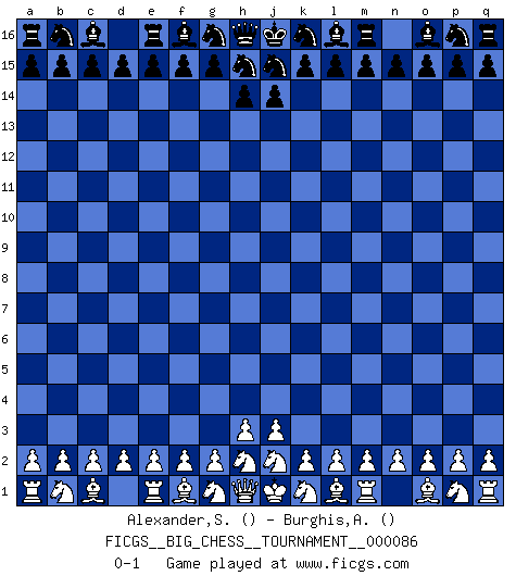 Last move : 0-1 2012 November 1 22:4:49 [Event "FICGS__BIG_CHESS__TOURNAMENT__000086"] [Site "FICGS"] [Date "2012.10.02"] [Round "1"] [White "Alexander,Steven"] [Black "Burghis,Alexandru"] [Result "0-1"] [WhiteElo ""] [BlackElo ""] 0-1 This big chess game has been lost on time (started : 2012.10.02 17:2:48) Follow this game move after move (download)Spassky will not be psyched out by Fischer. (Mike Goodall) Die Leute spielen gegen mich seit 15 Jahren unter Ihren Möglichkeiten. (Robert James Fischer) Yo no le temo a Spassky. Todos saben que yo soy el mejor. Uno no necesita un torneo para probarlo. (Bobby Fischer) Les échecs, c'est l'art d'analyser. (Mikhail Botvinnik) As a goal marker shodan is important. As a destination it is a poor place to stop. (Thomas Tamayo)