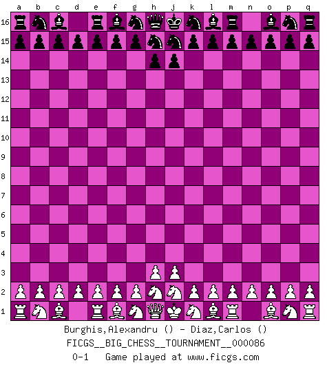 Last move : 0-1 2012 November 1 22:4:49 [Event "FICGS__BIG_CHESS__TOURNAMENT__000086"] [Site "FICGS"] [Date "2012.10.02"] [Round "1"] [White "Burghis,Alexandru"] [Black "Diaz,Carlos"] [Result "0-1"] [WhiteElo ""] [BlackElo ""] 0-1 This big chess game has been lost on time (started : 2012.10.02 17:2:48) Follow this game move after move (download)Could we look into the head of a Chess player, we should see there a whole world of feelings, images, ideas, emotion and passion. (Alfred Binet) Es hat in meinem Leben Zeiten gegeben, in denen das Schachspiel, wenn nicht zum Lebenszweck, so doch zu einem regelrechten Lebensersatz geworden ist. Man fühlt sich in solchen Zeiten nicht so, als besäße man eine göttliche Gabe, sondern eher so, als sei man von ihr besessen. (Garry Kasparov) Yo no creo en la psicología. Yo creo en las buenas movidas. (Bobby Fischer) La victoire dans une partie d'Echecs appartient la plupart du temps à celui qui voit un peu plus loin que l'adversaire. (Lasker) Luck is when opportunity knocks and you answer. (Anonymous)