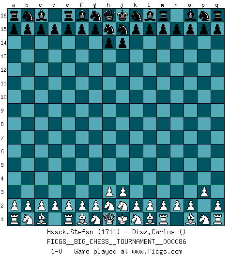 Last move : 1-0 2012 November 2 22:5:43 [Event "FICGS__BIG_CHESS__TOURNAMENT__000086"] [Site "FICGS"] [Date "2012.10.02"] [Round "1"] [White "Haack,Stefan"] [Black "Diaz,Carlos"] [Result "1-0"] [WhiteElo "1711"] [BlackElo ""] 1.p2-p3 1-0 This big chess game has been lost on time (started : 2012.10.02 17:2:48) Follow this game move after move (download)There must have been a time when men were demigods, or they could not have invented Chess. (Gustav Schenk) Der beste Spieler in einem Turnier gewinnt es nie. Er landet auf Platz zwei oder drei. (Siegbert Tarrasch) El Ajedrez, como cualquier actividad creativa, solo puede existir a través del esfuerzo combinado de aquellos que tienen talento creativo y de aquellos que poseen la habilidad de organizar su trabajo creativo. (Mikhail Botvinnik) Vous m'avez demandé de vous exposer quel est le fondement de la prière. Je ne fais que préparer les pièces du jeu sur la table... Nous sera-t-il permis d'en adopter les règles et si nous les appliquons scrupuleusement nous ne tarderons pas à faire mat le Roi divin ! Il ne pourra échapper à nos mains. (Sainte Thérèse d'Avila, Chemin de perfection) 'preceded by its own quotation yields a falsehood' preceded by its own quotation yields a falsehood. (W. V. O. Quine - Set Theory And Its Logic, 1953)
