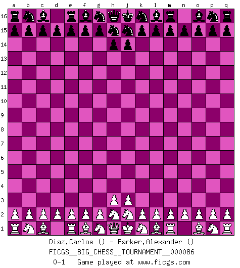 Last move : 0-1 2012 November 1 22:4:49 [Event "FICGS__BIG_CHESS__TOURNAMENT__000086"] [Site "FICGS"] [Date "2012.10.02"] [Round "1"] [White "Diaz,Carlos"] [Black "Parker,Alexander"] [Result "0-1"] [WhiteElo ""] [BlackElo ""] 0-1 This big chess game has been lost on time (started : 2012.10.02 17:2:48) Follow this game move after move (download)Help your pieces so they can help you. (Paul Morphy) Je mehr ich von der FIDE weiss, um so weniger verstehe ich. (Alexander Kalifman) De eso se trata el Ajedrez. Un día le das una lección a tu oponente y al día siguiente el te da una a tí. (Bobby Fischer) Les écrivains ont utilisé les échecs pour analyser les côtés extrêmes de la nature humaine. Dans ce cadre, les échecs offrent un champ d'expérimentation idéal. Mais on pourrait faire la même chose avec la peinture. Et là, en vous référant à Van Gogh, vous ne tirerez pas de conclusion définitive sur les peintres. (Gary Kasparov) A shortcut is the longest distance between two points. (Don Groves)