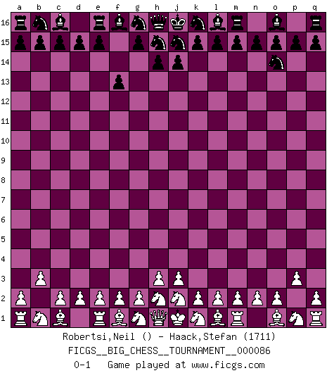 Last move : 0-1 2012 November 17 10:54:23 [Event "FICGS__BIG_CHESS__TOURNAMENT__000086"] [Site "FICGS"] [Date "2012.10.02"] [Round "1"] [White "Robertsi,Neil"] [Black "Haack,Stefan"] [Result "0-1"] [WhiteElo ""] [BlackElo "1711"] 1.p2-p3 f15-f13 2.b2-b3 p16-o14 0-1 This big chess game has been lost on time (started : 2012.10.02 17:2:48) Follow this game move after move (download)That's what Chess is all about. One day you give your opponent a lesson, the next day he gives you one. (Bobby Fischer) Taktik ist was man tun muß, wenn etwas zu tun ist. Strategie ist was man tun muß, wenn nichts zu tun ist. (Savielly Grigorievitsch Tartakower) Tu cuerpo tiene que estar en óptima condición. Tu Ajedrez se deteriora como lo hace tu cuerpo. No puedes separar la mente y el cuerpo. (Bobby Fischer) Il a essayé de se convaincre qu'il pourrait empêcher toutes les erreurs et ne jamais perdre. L'horreur ! Gary Kasparov au sujet de Robert Fischer. Tomorrow's what you make of it. (Horatio Caine, C.S.I. Miami)