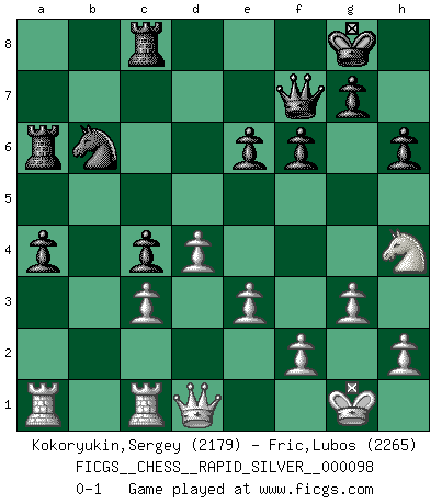 Last move : 0-1 2013 February 22 16:1:49 [Event "FICGS__CHESS__RAPID_SILVER__000098"] [Site "FICGS"] [Date "2012.10.02"] [Round "1"] [White "Kokoryukin,Sergey"] [Black "Fric,Lubos"] [Result "0-1"] [WhiteElo "2179"] [BlackElo "2265"] 1.d4 d5 2.c4 c6 3.Nf3 Nf6 4.Nc3 e6 5.Bg5 h6 6.Bxf6 Qxf6 7.Qc2 dxc4 8.e3 b5 9.a4 Bb7 10.axb5 cxb5 11.Nxb5 Bb4+ 12.Nc3 O-O 13.Be2 Nd7 14.O-O Rfc8 15.Rfc1 a5 16.Na4 Rc7 17.Nc3 R7c8 18.Nd2 Nb6 19.Bf3 Bxf3 20.Nxf3 Qe7 21.Qd1 Nd5 22.g3 Qb7 23.Qe2 Nb6 24.Qd1 Ra6 25.Ne5 f6 26.Ng6 Qf7 27.Nh4 Bxc3 28.bxc3 a4 0-1 This chess game has been lost on time (started : 2012.10.02 17:30:16) QGD Slav : 4.Nc3 Kingside Castling by player Black (move 12) Kingside Castling by player White (move 14) Player Black won this chess game. Follow this game move after move (download)Don't even mention losing to me. I can't stand to think of it. (Bobby Fischer) Wenn ich mich einlogge, glauben die Leute gewöhnlich nicht, dass ich es selbst bin und sie fangen an, mir dumme Fragen zu stellen. Und wenn sie es glauben, stellen sie wieder andere dumme Fragen. (Judith Polgar) Si el ingenio solamente fuese necesario para lucirse, las mujeres serían las mejores jugadoras de Ajedrez del mundo. (Albin) Seul un grand joueur sait à quel point il joue faiblement. (Xavier Tartacover) Man is reluctant to give credit for intelligence to anyone, except his enemies. (Albert Einstein)