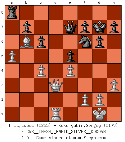 Last move : 1-0 2013 March 4 17:1:2 [Event "FICGS__CHESS__RAPID_SILVER__000098"] [Site "FICGS"] [Date "2012.10.02"] [Round "2"] [White "Fric,Lubos"] [Black "Kokoryukin,Sergey"] [Result "1-0"] [WhiteElo "2265"] [BlackElo "2179"] 1.e4 g6 2.d4 Bg7 3.Nc3 d6 4.Nf3 Nf6 5.Be2 O-O 6.O-O c6 7.a4 Qc7 8.a5 e5 9.dxe5 dxe5 10.Be3 Nh5 11.Qd2 Nf4 12.Rfd1 Nxe2+ 13.Qxe2 Na6 14.b4 Qe7 15.b5 Nc7 16.b6 axb6 17.Na4 Bg4 18.h3 Bxf3 19.Qxf3 Ne6 20.Bxb6 Rfe8 21.c3 Bf8 22.Qe3 Bg7 23.Nc5 Bh6 24.Qxh6 Nxc5 25.Qe3 Nd7 26.Bc7 Nf6 27.Bd6 Qe6 28.Bc5 Red8 29.Rxd8+ Rxd8 30.Rb1 Qd7 31.c4 Ra8 32.Qf3 Kg7 33.Rd1 Qc7 34.Bb6 Qe7 35.Qd3 1-0 This chess game has been lost on time (started : 2012.10.02 17:30:16) Robatsch defense : Two knights variation Kingside Castling by player Black (move 5) Kingside Castling by player White (move 6) Player White won this chess game. Follow this game move after move (download)The tactician knows what to do when there is something to do; whereas the strategian knows what to do when there is nothing to do. (Gerald Abrahams) Das Schachspiel übertrifft alle anderen Spiele so weit wie der Chimborasso einen Misthaufen. (Arthur Schopenhauer) Un sacrificio se refuta mucho mejor al aceptarlo. (Wilhelm Steinitz) Celui qui prend des risques peut perdre, celui qui n'en prend pas perd toujours. (Xavier Tartacover) If you are going through hell, keep going. (Winston Churchill)