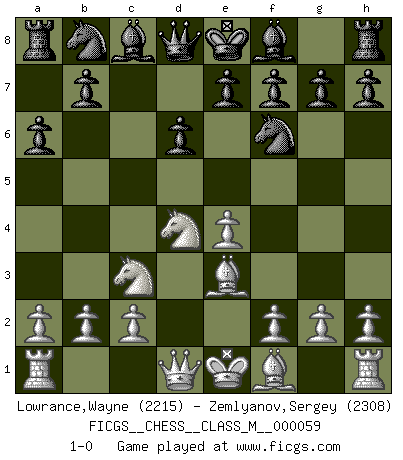 Last move : 1-0 2012 December 26 11:7:13 [Event "FICGS__CHESS__CLASS_M__000059"] [Site "FICGS"] [Date "2012.10.03"] [Round "1"] [White "Lowrance,Wayne"] [Black "Zemlyanov,Sergey"] [Result "1-0"] [WhiteElo "2215"] [BlackElo "2308"] 1.e4 c5 2.Nf3 d6 3.d4 cxd4 4.Nxd4 Nf6 5.Nc3 a6 6.Be3 1-0 This chess game has been lost on time (started : 2012.10.03 12:26:12) Sicilian : Najdorf, Byrne (English) attack Player White won this chess game. Follow this game move after move (download)Chess is as much a mystery as women. (Purdy) Ein guter Spieler hat immer Glück. (José Raúl Capablanca) El juego de Damas es para vagabundos. (Paul Morphy) Je crois qu'il existe des manières très spécifiques de jouer efficacement contre une machine. Evidemment, nous n'avons aucune chance en technique pure, parce que l'ordinateur calcule de manière parfaite. Mais lorsque nous faisons appel à notre cerveau, en utilisant l'intuition et la compréhension, alors nous restons beaucoup plus forts. (Anatoli Karpov) Inventor: A person who makes an ingenious arrangement of wheels, levers and springs, and believes it civilization. (Ambrose Bierce, The Devil's Dictionary)