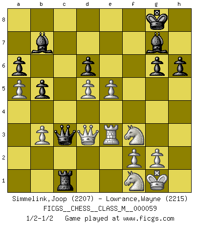 Last move : 1/2-1/2 2013 February 8 19:54:17 [Event "FICGS__CHESS__CLASS_M__000059"] [Site "FICGS"] [Date "2012.10.03"] [Round "1"] [White "Simmelink,Joop"] [Black "Lowrance,Wayne"] [Result "1/2-1/2"] [WhiteElo "2207"] [BlackElo "2215"] 1.e4 e5 2.Nf3 Nc6 3.Bb5 a6 4.Ba4 Nf6 5.O-O Be7 6.Re1 b5 7.Bb3 d6 8.c3 O-O 9.h3 Bb7 10.d4 Re8 11.Nbd2 Bf8 12.a4 exd4 13.cxd4 h6 14.Bc2 Nb4 15.Bb1 c5 16.d5 g6 17.Nf1 Bg7 18.Ra3 Nd7 19.a5 Rc8 20.Re2 c4 21.Qe1 Nd3 22.Bxd3 cxd3 23.Rxd3 Nc5 24.Rde3 Qc7 25.Rc2 Qd7 26.b3 Nd3 27.Qd2 Rxc2 28.Qxc2 Rc8 29.Qxd3 Rxc1 30.h4 Qc8 31.h5 Qc3 32.hxg6 fxg6 33.e5 1/2-1/2 Ruy Lopez : Closed Kingside Castling by player White (move 5) Kingside Castling by player Black (move 8) This chess game ended in a draw. Follow this game move after move (download)In Chess, at least, the brave inherit the earth. (Edmar Mednis) Du musst nicht gut spielen, es reicht, wenn du besser spielst als dein Gegner. (Anonymous) Entre mas años cumplo, mas valoro los Peones. (Keres) Ce n'est pas pour s'amuser qu'il joue aux échecs : il célèbre un culte. (Vladimir Nabokov) I couldn't make any sense out of what this particular thread is about. It sounds like R2 D2 computer speaking. A space fight ?!? Some 'command' problems in Moscow ? Some killers & narcotic addicts attacking some game & a god wannabe ?? (Dinesh De Silva, lost in a russian conflict in FICGS forum)