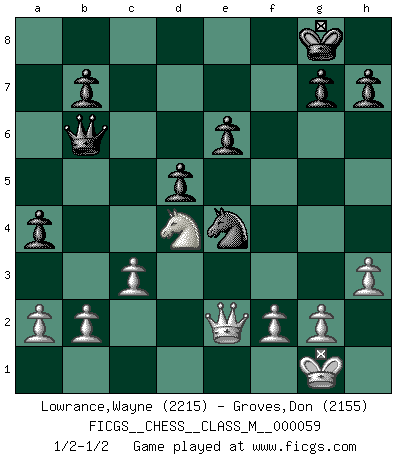 Last move : 1/2-1/2 2013 February 11 5:40:44 [Event "FICGS__CHESS__CLASS_M__000059"] [Site "FICGS"] [Date "2012.10.03"] [Round "1"] [White "Lowrance,Wayne"] [Black "Groves,Don"] [Result "1/2-1/2"] [WhiteElo "2215"] [BlackElo "2155"] 1.e4 e6 2.d4 d5 3.Nd2 c5 4.Ngf3 Nf6 5.exd5 exd5 6.Bb5+ Bd7 7.Bxd7+ Nbxd7 8.O-O Be7 9.dxc5 Nxc5 10.Nb3 Nce4 11.Re1 O-O 12.Be3 Re8 13.Qd3 Qd7 14.Rad1 a5 15.c3 a4 16.Nbd4 Bc5 17.h3 Rac8 18.Nb5 Bxe3 19.Rxe3 Nc5 20.Rxe8+ Rxe8 21.Qf1 Qc6 22.Nfd4 Qb6 23.Re1 Ne6 24.Nxe6 Rxe6 25.Rxe6 fxe6 26.Qe2 Ne4 27.Nd4 1/2-1/2 French : Tarrasch, Open variation Kingside Castling by player White (move 8) Kingside Castling by player Black (move 11) This chess game ended in a draw. Follow this game move after move (download)Up to this point White has been following well-known analysis. But now he makes a fatal error: he begins to use his own head. (Siegbert Tarrasch) Ein Buch ist ein Spiegel; wenn ein Affe hineinsieht, so kann kein Apostel heraus gucken. (Georg Christoph Lichtenberg) Después de la respuesta de las negras a 1.e4 con 1..e5, se quedan siempre tratando de entrar dentro del juego. (Howard Staunton) Votre prénom est 'Tactique', votre deuxième prénom est 'Tactique' et votre nom est 'Tactique'. (Ken Smith) I teach you to lie, cheat and steal, and as soon as my back's turned you wait in line ? (Gregory House, House M.D.)