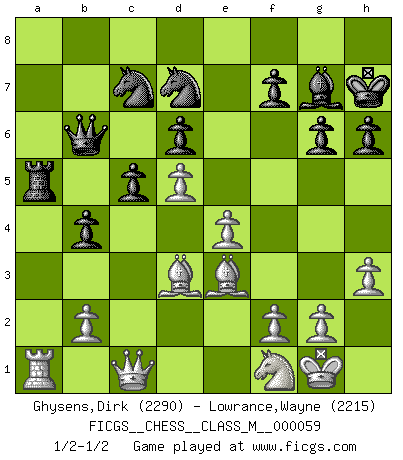 Last move : 1/2-1/2 2013 April 8 23:10:6 [Event "FICGS__CHESS__CLASS_M__000059"] [Site "FICGS"] [Date "2012.10.03"] [Round "1"] [White "Ghysens,Dirk"] [Black "Lowrance,Wayne"] [Result "1/2-1/2"] [WhiteElo "2290"] [BlackElo "2215"] 1.e4 e5 2.Nf3 Nc6 3.Bb5 a6 4.Ba4 Nf6 5.O-O Be7 6.Re1 b5 7.Bb3 d6 8.c3 O-O 9.h3 Bb7 10.d4 Re8 11.Nbd2 Bf8 12.Bc2 h6 13.a4 exd4 14.cxd4 Nb4 15.Bb1 c5 16.d5 g6 17.Nf1 Bg7 18.axb5 axb5 19.Rxa8 Qxa8 20.Bf4 Qa6 21.Ng3 Kh7 22.Re3 Qb6 23.Ra3 Na6 24.Be3 Bc8 25.Qf1 Bd7 26.Qd3 Nc7 27.Ra1 b4 28.Nd2 Bb5 29.Nc4 Bxc4 30.Qxc4 Nd7 31.Qc1 Ra8 32.Bd3 Ra5 33.Nf1 1/2-1/2 Ruy Lopez : Closed Kingside Castling by player White (move 5) Kingside Castling by player Black (move 8) This chess game ended in a draw. Follow this game move after move (download)When you absolutely don't know what to do anymore, it is time to panic. (John van der Wiel) Schach ist das schnellste Spiel der Welt, weil man in jeder Sekunde Tausende von Gedanken ordnen muß. (Albert Einstein) Muchos se han convertido en Maestros de Ajedrez, nadie se ha convertido en el Maestro del Ajedrez. (Siegbert Tarrasch) Si le désir cupide (et stupide) de gagner est une inépuisable source de souffrance, une combinaison brillante sur l'échiquier est une découverte : le coquelicot qui s'épanouit lorsque apparaît la Voie Lactée. (Arrabal) Industry executives and analysts often mistakenly talk about strategy as if it were some kind of chess match. But in chess, you have just two opponents, each with identical resources, and with luck playing a minimal role. The real world is much more like a poker game, with multiple players trying to make the best of whatever hand fortune has dealt them. In our industry, Bill Gates owns the table until someone proves otherwise. (David Moschella, 'Computerworld')