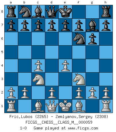 Last move : 1-0 2012 December 29 23:17:51 [Event "FICGS__CHESS__CLASS_M__000059"] [Site "FICGS"] [Date "2012.10.03"] [Round "1"] [White "Fric,Lubos"] [Black "Zemlyanov,Sergey"] [Result "1-0"] [WhiteElo "2265"] [BlackElo "2308"] 1.Nf3 Nf6 2.c4 g6 3.Nc3 Bg7 4.e4 1-0 This chess game has been lost on time (started : 2012.10.03 12:26:12) Reti Opening Player White won this chess game. Follow this game move after move (download)Chess is really ninety nine percent calculation. (Soltis) Kann Schach nicht schließlich das Nationalspiel der Deutschen werden? Und welche weiteren Ausblicke bieten sich dann dar! Welche Hebung des allgemeinen Kultur-Niveaus, ja der Moral, wenn das Schachbrett den Kartentisch verdrängen würde! Wahrlich, ein Ziel, des Schweißes der Edlen wert! (Siegbert Tarrasch) Los Peones son nacidos libres, y aún así, se encuentran encadenados por todos lados. (Rick Kennedy) Que feriez-vous si vous étiez en train de jouer aux échecs et que la fin du monde arrive ? Je continuerais à jouer. (Saint Borromée) Coffee just isn't my cup of tea. (Unknown)