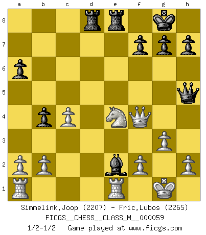 Last move : 1/2-1/2 2012 November 9 14:49:18 [Event "FICGS__CHESS__CLASS_M__000059"] [Site "FICGS"] [Date "2012.10.03"] [Round "1"] [White "Simmelink,Joop"] [Black "Fric,Lubos"] [Result "1/2-1/2"] [WhiteElo "2207"] [BlackElo "2265"] 1.e4 e5 2.Nf3 Nc6 3.Bb5 a6 4.Ba4 Nf6 5.O-O Be7 6.Re1 b5 7.Bb3 O-O 8.c3 d5 9.exd5 Nxd5 10.Nxe5 Nxe5 11.Rxe5 c6 12.d3 Bd6 13.Re1 Bf5 14.Qf3 Qh4 15.g3 Qh3 16.Bxd5 cxd5 17.Qxd5 Rad8 18.Qg2 Qh5 19.Be3 Bxd3 20.Nd2 b4 21.c4 Be5 22.Bb6 Rb8 23.Qd5 Be2 24.Bd4 Bxd4 25.Qxd4 Rbd8 26.Qf4 Rfe8 27.Ne4 1/2-1/2 Ruy Lopez : Closed, 7...O-O Kingside Castling by player White (move 5) Kingside Castling by player Black (move 7) This chess game ended in a draw. Follow this game move after move (download)I love all positions. Give me a difficult positional game, I will play it. But totally won positions, I cannot stand them. (Hein Donner) Ich trinke, ich rauche, ich spiele, ich liebe Frauen aber Fernschach ist ein Laster, das ich nicht habe. (Mikhail Nekhemyevich Tal) Para mi, el Ajedrez es la vida y cada partida es como una nueva vida. Todo jugador de Ajedrez suele vivir muchas vidas durante su vida. (Eduard Gufeld) Les échecs c'est le défi de l'alpiniste, toujours plus haut, prêt à tout pour monter à l'assaut du Roi ennemi. Les échecs, c'est de la musique en mouvement, un ballet majestueux pour les yeux. C'est de la poésie composée par les fantômes du passé qui au même titre que Rimbaud ou Verlaine méritent notre admiration. Les échecs, c'est de la peinture ou le moindre mouvement modifie le tableau pour en faire un Picasso ou un Van Gogh. Les échecs, c'est tout et rien, c'est la vie et la mort. Jjulie33 sur le forum de France-Echecs. The difference between stupidity and genius is that genius has its limits. (Murphy)