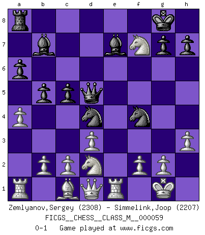 Last move : 0-1 2013 January 13 0:15:35 [Event "FICGS__CHESS__CLASS_M__000059"] [Site "FICGS"] [Date "2012.10.03"] [Round "1"] [White "Zemlyanov,Sergey"] [Black "Simmelink,Joop"] [Result "0-1"] [WhiteElo "2308"] [BlackElo "2207"] 1.e4 e5 2.Nf3 Nc6 3.Bb5 a6 4.Ba4 Nf6 5.O-O Be7 6.Re1 b5 7.Bb3 O-O 8.h3 Bb7 9.d3 d5 10.exd5 Nxd5 11.Nxe5 Nd4 12.Nd2 c5 13.a4 Nf4 14.Bxf7+ Rxf7 15.Nxf7 Qd5 0-1 Ruy Lopez : Closed, 7...O-O Kingside Castling by player White (move 5) Kingside Castling by player Black (move 7) Player Black won this chess game. Follow this game move after move (download)Bobby is the most misunderstood, misquoted celebrity walking the face of this earth. (Yasser Seirawan) Der Verteidiger gebe der Gewalt nach, aber nur der Gewalt. Er schaffe sich nicht freiwillig, etwa aus Blindheit oder aus Schrecken, irgendwelche Schwächen. Er lasse sich nicht bluffen. (Emanuel Lasker) Bobby Fischer es el jugador de Ajedrez mas grande que jamás haya existido. (Ken Smith) Le pion, dans sa simplicité, marche droit devant lui, mais lorsqu'il prend, il le fait obliquement? Ainsi l'homme, tant qu'il reste pauvre, marche dans la droiture et vit honnêtement, mais lorsqu'il recherche les honneurs, il flatte, se parjure et, par les voies obliques, cherche une position supérieure sur l'échiquier du monde. (Jean de Galles) I find your interest interesting. (Gregory House, House M.D.)
