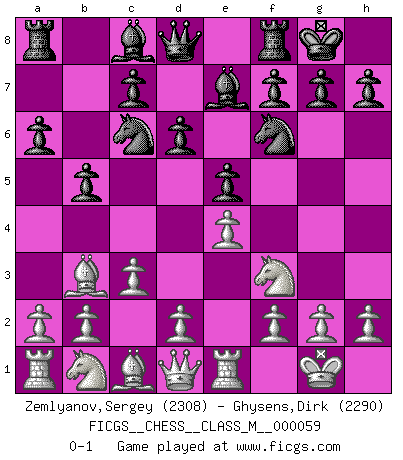 Last move : 0-1 2012 December 8 23:35:58 [Event "FICGS__CHESS__CLASS_M__000059"] [Site "FICGS"] [Date "2012.10.03"] [Round "1"] [White "Zemlyanov,Sergey"] [Black "Ghysens,Dirk"] [Result "0-1"] [WhiteElo "2308"] [BlackElo "2290"] 1.e4 e5 2.Nf3 Nc6 3.Bb5 a6 4.Ba4 Nf6 5.O-O Be7 6.Re1 b5 7.Bb3 d6 8.c3 O-O 0-1 This chess game has been lost on time (started : 2012.10.03 12:26:12) Ruy Lopez : Closed Kingside Castling by player White (move 5) Kingside Castling by player Black (move 8) Player Black won this chess game. Follow this game move after move (download)The tactician knows what to do when there is something to do; whereas the strategian knows what to do when there is nothing to do. (Gerald Abrahams) Es gibt keine einzige Frau, der ich nicht einen Springer vorgeben könnte und trotzdem gewänne. (Robert James Fischer) El juego de Damas es para vagabundos. (Paul Morphy) Les Echecs ont trois composantes : le temps, l'espace et le matériel en dernier. (Mikhail Tal) For a mechanic, you seem to do an excessive amount of thinking. (C-3PO in Star Wars ep.2)