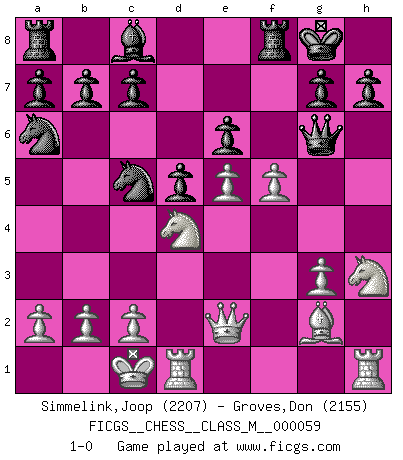 Last move : 1-0 2012 October 10 1:22:21 [Event "FICGS__CHESS__CLASS_M__000059"] [Site "FICGS"] [Date "2012.10.03"] [Round "1"] [White "Simmelink,Joop"] [Black "Groves,Don"] [Result "1-0"] [WhiteElo "2207"] [BlackElo "2155"] 1.e4 e6 2.d4 d5 3.Nc3 Nf6 4.Bg5 Be7 5.e5 Nfd7 6.h4 Bxg5 7.hxg5 Qxg5 8.Nb5 Na6 9.Nh3 Qh6 10.g3 f6 11.Qe2 fxe5 12.dxe5 O-O 13.Bg2 Qg6 14.O-O-O Rf5 15.f4 Ndc5 16.Nd4 Rf8 17.f5 1-0 Joop Simmelink thanks for the game! French : Albin-Alekhine-Chatard attack Kingside Castling by player Black (move 12) Queenside Castling by player White (move 14) Player White won this chess game. Follow this game move after move (download)The game of Chess is not merely an idle amusement; several very valuable qualities of the mind are to be acquired and strengthened by it, so as to become habits ready on all occasions; for life is a kind of Chess. (Benjamin Franklin) Das ganze Leben mit einer Ehefrau ist wie ein Endspiel mit ungleichfarbigen Läufern. (Viktor Kortschnoi) Vive, pierde y aprende al observar a tu oponente como gana. (Amber Steenbock) Un footballeur joue avec ses pieds, parfois avec sa tête. Un joueur d'échecs ne joue qu'avec sa tête. Et quand il ne joue plus, il meurt. (Jacob Murray) In every real man a child is hidden that wants to play. (Friedrich Nietzsche)