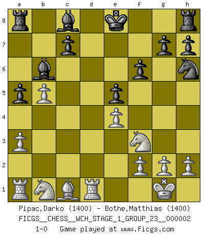 Last move : 1-0 2007 March 5 22:48:33 [Event "FICGS__CHESS__WCH_STAGE_1_GROUP_23__000002"] [Site "FICGS"] [Date "2007.01.16"] [Round "1"] [White "Pipac,Darko"] [Black "Bothe,Matthias"] [Result "1-0"] [WhiteElo "1400"] [BlackElo "1400"] 1.e4 e5 2.Nf3 Nc6 3.Bb5 f6 4.d4 d6 5.dxe5 dxe5 6.Qxd8+ Kxd8 7.O-O Bc5 8.Bxc6 bxc6 9.Rd1+ Ke8 10.a3 Nh6 11.b4 Bb6 12.c4 a5 13.b5 cxb5 14.cxb5 1-0 Ruy Lopez : Nuernberg variation Kingside Castling by player White (move 7) Player White won this chess game. Follow this game move after move (download)I give 98 percent of my mental energy to Chess. Others give only 2 percent. (Bobby Fischer) Oft bringt ein stiller Zug das Erdbeben. (Richard Reti) Entre mas años cumplo, mas valoro los Peones. (Keres) Je ne suis pas le dernier à jouer lâchement des coups douteux pendant le zeïtnot de l'adversaire pour l'achever: en effet les coups qui font le plus peur sont ceux que l'on ne comprend pas. Je me fais souvent peur quand je joue. (Un professeur anonyme) Wisdom doesn't necessarily come with age. Sometimes age just shows up all by itself. (Tom Watson)