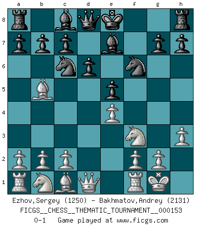 Last move : 0-1 2012 November 16 10:55:11 [Event "FICGS__CHESS__THEMATIC_TOURNAMENT__000153"] [Site "FICGS"] [Date "2012.10.05"] [Round "1"] [White "Ezhov,Sergey"] [Black "Bakhmatov,Andrey"] [Result "0-1"] [WhiteElo "1250"] [BlackElo "2131"] 1.e4 e5 2.Nf3 Nc6 3.Bb5 f5 4.d3 fxe4 5.dxe4 Nf6 6.O-O d6 7.h3 Be7 0-1 This chess game has been lost on time (started : 2012.10.05 11:56:57) Ruy Lopez : Schliemann defense Kingside Castling by player White (move 6) Player Black won this chess game. Follow this game move after move (download)What is the difference between chess and football? Everybody understands football, but nobody plays it. Everybody plays chess, but nobody understands it. Everything is relative. (Vladimir Kramnik) Mutter, ich bin eben Ex-Weltmeister geworden. --beim nach Hause Kommen nach dem Verlust des WM-Titels an Mihail Botvinnik -- (Mikhail Nekhemyevich Tal) No puedes jugar al Ajedrez si eres de corazón noble. (Proverbio Francés) On est toujours la mazette de quelqu'un d'autre. (Anonyme) There are two kinds of tragedy in this world, one is not getting what you want and the other is getting. (Lord of war)