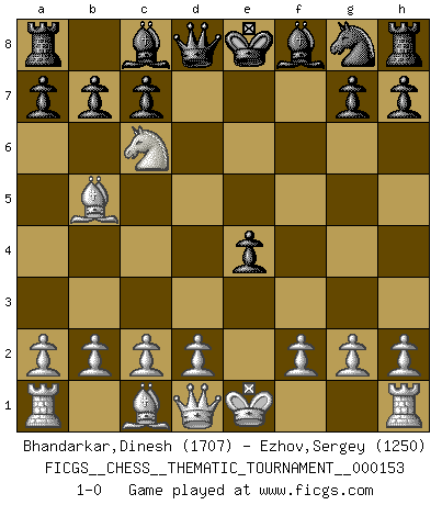 Last move : 1-0 2012 November 16 10:55:11 [Event "FICGS__CHESS__THEMATIC_TOURNAMENT__000153"] [Site "FICGS"] [Date "2012.10.05"] [Round "1"] [White "Bhandarkar,Dinesh"] [Black "Ezhov,Sergey"] [Result "1-0"] [WhiteElo "1707"] [BlackElo "1250"] 1.e4 e5 2.Nf3 Nc6 3.Bb5 f5 4.Nc3 fxe4 5.Nxe4 d5 6.Nxe5 dxe4 7.Nxc6 1-0 This chess game has been lost on time (started : 2012.10.05 11:56:57) Ruy Lopez : Schliemann defense, Berger variation Player White won this chess game. Follow this game move after move (download)Avoid the crowd. Do your own thinking independently. Be the Chess player, not the Chess piece. (Ralph Charell) Ein guter Spieler hat immer Glück. (José Raúl Capablanca) Cuando le juegas a Fischer, no es una cuestion de si vas a ganar o perder. Es una cuestion de si vas a sobrevivir. (Boris Spassky) Aux échecs, les retours au sommet sont rares : les dommages psychologiques consécutifs à une défaite sont trop sévères. (Daily Telegraph) Memory is a complicated thing, a relative to truth, but not its twin. (Barbara Kingsolver, Animal Dreams)