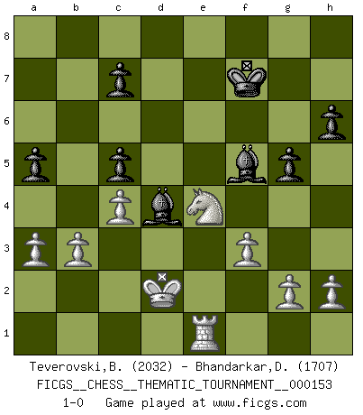 Last move : 1-0 2013 January 26 0:56:39 [Event "FICGS__CHESS__THEMATIC_TOURNAMENT__000153"] [Site "FICGS"] [Date "2012.10.05"] [Round "1"] [White "Teverovski,Bogoljub"] [Black "Bhandarkar,Dinesh"] [Result "1-0"] [WhiteElo "2032"] [BlackElo "1707"] 1.e4 e5 2.Nf3 Nc6 3.Bb5 f5 4.d3 fxe4 5.dxe4 Nf6 6.O-O Bc5 7.Bxc6 bxc6 8.Nxe5 O-O 9.Nc3 Re8 10.Nd3 Bd4 11.Ne2 Bb6 12.Bg5 d6 13.Ng3 h6 14.Bxf6 Qxf6 15.Qh5 Be6 16.Rae1 Rf8 17.e5 dxe5 18.Qxe5 Bd5 19.Qxf6 Rxf6 20.b3 Ba5 21.Re7 Raf8 22.c4 Bf7 23.a3 Bg6 24.Ne5 Bb6 25.Nd7 R6f7 26.Nxf8 Kxf8 27.Rxf7+ Kxf7 28.Re1 a5 29.Ne4 Bd4 30.Kf1 c5 31.f3 Bf5 32.Ke2 g5 33.Kd2 1-0 Ruy Lopez : Schliemann defense Kingside Castling by player White (move 6) Kingside Castling by player Black (move 8) Player White won this chess game. Follow this game move after move (download)The Pin is mightier than the sword. (Fred Reinfeld) Das Schach hält seine Meister in eigenen Banden, Fesseln; auf vielerlei Weise formt es ihren Geist, so dass die innere Freiheit selbst des Stärksten beeinflusst wird. (Albert Einstein) Un jugador que trata de regresar una movida en el Ajedrez es un futuro carterista. (Richard Fenton) Il n'y a pas de prix trop élevé au scalp de l'ennemi. (Koblentz) Creativity is allowing yourself to make mistakes. Art is knowing which ones to keep. (Scott Adams)