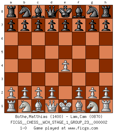 Last move : 1-0 2007 February 15 22:29:16 [Event "FICGS__CHESS__WCH_STAGE_1_GROUP_23__000002"] [Site "FICGS"] [Date "2007.01.16"] [Round "1"] [White "Bothe,Matthias"] [Black "Lam,Cam"] [Result "1-0"] [WhiteElo "1400"] [BlackElo "0870"] 1.e4 1-0 This chess game has been lost on time (started : 2007.01.16 15:35:12) King's pawn Opening Player White won this chess game. Follow this game move after move (download)Help your pieces so they can help you. (Paul Morphy) Auf Remis zu spielen ist gewissermaßen ein Verbrechen gegen das Schachspiel. (Mikhail Nekhemyevich Tal) Solo puedes ser bueno en el Ajedrez si amas al juego. (Bobby Fischer) Si le désir cupide (et stupide) de gagner est une inépuisable source de souffrance, une combinaison brillante sur l'échiquier est une découverte : le coquelicot qui s'épanouit lorsque apparaît la Voie Lactée. (Arrabal) Lottery : A tax on people who are bad at math. (Author unknown)