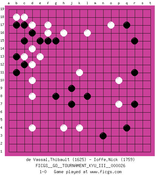 Last move : 1-0 2012 December 20 10:28:53 [Event "FICGS__GO__TOURNAMENT_KYU_III__000026"] [Site "FICGS"] [Date "2012.10.05"] [Round "1"] [Black "de Vassal,Thibault"] [White "Ioffe,Nick"] [Result "1-0"] [Rating 1 "1625"] [Rating 2 "1759"] 1.q4 d4 2.q17 d17 3.r11 l16 4.c15 c13 5.e15 f17 6.g15 h16 7.c17 c18 8.b17 b18 9.d16 f16 10.f15 o17 11.r15 d10 12.d13 d12 13.c12 e13 14.b13 d14 15.b11 k4 16.n3 p10 17.r7 p7 18.j9 k11 19.j7 h4 20.g8 d8 21.l8 1-0 This go game has been lost on time (started : 2012.10.05 16:27:36) Here are the names of the openings (joseki) played in the four corners : Corner d16 : d17 c15 Komoku (Somok, Xiao~mu`) 3-4 Point. The komoku (3-4) point is the traditional corner enclosure move.. Ikken Kakari (Hankan Keolch'im, Yi Gua`jiao~, 1-Space Low Pincer). The small knight move is the basic approach move to the 3-4 point stone. It has been continually used for over four centuries. There are limitless variations, with new moves constantly being discovered. Black 2 opens the door to a treaure store of joseki. Corner d4 : d4 j9 Hoshi (Hwajeom, Seongjeom, Xingwei`) 4-4 Point. The star or hoshi (4-4) point, emphasizing influence at the potential expense of territory. Player Black won this Go (weiqi, baduk) game. Follow this game move after move (download)Don't make compact groups of stones. (Anonymous) Children in the dark cause accidents, accidents in the dark cause children. (Unknown)