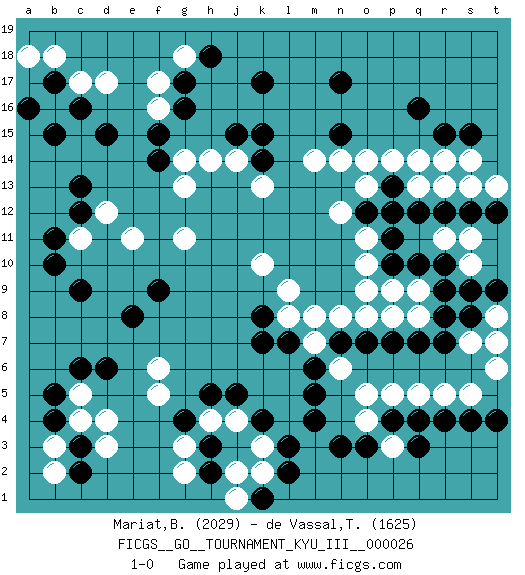 Last move : 1-0 2013 March 12 10:9:59 [Event "FICGS__GO__TOURNAMENT_KYU_III__000026"] [Site "FICGS"] [Date "2012.10.05"] [Round "1"] [Black "Mariat,Benoit"] [White "de Vassal,Thibault"] [Result "1-0"] [Rating 1 "2029"] [Rating 2 "1625"] 1.q16 d4 2.q3 d17 3.r9 c11 4.g16 k3 5.d15 b16 6.n17 r14 7.r15 q14 8.r12 o14 9.c6 c5 10.d6 g3 11.c9 e11 12.c16 c17 13.b15 g18 14.b17 b18 15.a16 g11 16.b10 m14 17.k17 k10 18.n3 r5 19.r4 q5 20.r7 o5 21.m5 n6 22.m6 o8 23.p10 o9 24.c3 d3 25.b5 c4 26.b4 b3 27.c2 b2 28.s15 o10 29.p11 o11 30.m4 m7 31.l7 l8 32.k7 f16 33.f15 f17 34.b11 j14 35.c12 g14 36.f14 s5 37.s4 s13 38.s12 t8 39.s8 t7 40.t9 t6 41.k8 l9 42.f9 f5 43.l2 k2 44.l3 d12 45.c13 g13 46.h18 q9 47.q10 s10 48.s9 s11 49.t12 s14 50.p13 p14 51.o12 q13 52.n15 n14 53.k4 j4 54.j5 h4 55.n7 m8 56.p7 p9 57.q12 r11 58.o7 p3 59.p4 p5 60.q4 q8 61.q7 n12 62.t4 o13 63.p12 r13 64.h5 f6 65.e8 s7 66.r8 t13 67.r10 o4 68.o3 n8 69.k15 p8 70.k14 k13 71.j15 h14 72.g17 a18 73.k1 j2 74.h2 j1 75.h3 g2 76.g4 1-0 Benoit Mariat Merci pour la partie. C'est dommage que tu m'aies laisse faire revivre mon groupe. Sinon en te laissant reduire le centre (et en tuant le groupe), je pense que la partie etait serree bien que tu sois en avance. Thibault de Vassal Oh, j'ai de toute facon encore trop de faiblesses dans mon jeu pour tenir la distance :-) Here are the names of the openings (joseki) played in the four corners : Corner d4 : d4 c6 Hoshi (Hwajeom, Seongjeom, Xingwei`) 4-4 Point. The star or hoshi (4-4) point, emphasizing influence at the potential expense of territory. Ikken Kakari (Hankan Keolch'im, Yi Gua`jiao~, 1-Space Low Approach). Black 2 is the standard approach move to the 4-4. Player Black won this Go (weiqi, baduk) game. Follow this game move after move (download)Territory really exists only in the end. (Pierre Audouard) They say poker is a zero-sum game. It must be, because every time I play my sum ends up zero. (Max Shapiro)