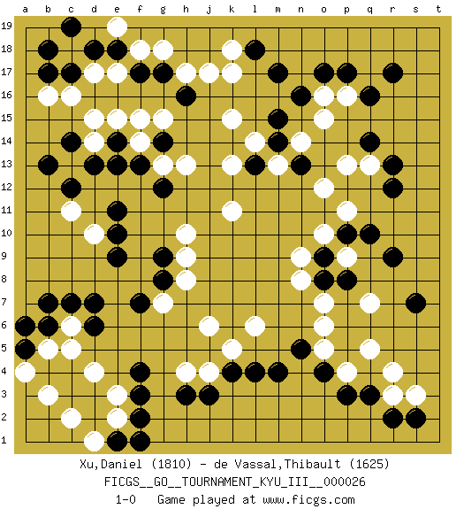 Last move : 1-0 2012 December 5 22:32:24 [Event "FICGS__GO__TOURNAMENT_KYU_III__000026"] [Site "FICGS"] [Date "2012.10.05"] [Round "1"] [Black "Xu,Daniel"] [White "de Vassal,Thibault"] [Result "1-0"] [Rating 1 "1810"] [Rating 2 "1625"] 1.q16 d4 2.q3 d17 3.r9 c11 4.f3 e3 5.f4 c6 6.k4 q5 7.o4 r3 8.r2 r4 9.s2 q7 10.s7 o6 11.m4 p9 12.r12 k17 13.m17 k15 14.c17 c16 15.d18 e17 16.b18 b16 17.e18 f18 18.f17 g18 19.g17 h17 20.h16 j17 21.m15 k13 22.e11 d14 23.f13 k11 24.d13 f14 25.e14 e15 26.e13 g15 27.c14 d15 28.g14 f15 29.e9 d10 30.e10 l6 31.f2 e2 32.r17 p11 33.q10 p13 34.p10 o10 35.o9 o12 36.p8 n9 37.o8 n8 38.c7 o7 39.q14 c13 40.c12 o15 41.n16 o16 42.o17 n14 43.b6 b5 44.d6 c5 45.d7 j6 46.b17 e19 47.c19 h10 48.e1 d1 49.f1 c2 50.b13 g7 51.l18 j4 52.j3 k5 53.l4 h4 54.h3 g13 55.g12 h13 56.b7 q13 57.r13 p16 58.p17 k18 59.a5 a4 60.a6 b3 61.g9 h9 62.g8 h8 63.f7 p4 64.p3 o5 65.n5 s3 66.m14 m13 67.l13 l14 68.n13 1-0 Here are the names of the openings (joseki) played in the four corners : Corner d4 : d4 f3 Hoshi (Hwajeom, Seongjeom, Xingwei`) 4-4 Point. The star or hoshi (4-4) point, emphasizing influence at the potential expense of territory. Ikken Kakari (Hankan Keolch'im, Yi Gua`jiao~, 1-Space Low Approach). Black 2 is the standard approach move to the 4-4. Player Black won this Go (weiqi, baduk) game. Follow this game move after move (download)Avoid the plate connection. (Anonymous) Fortune favours the audacious. (Desiderius Erasmus)