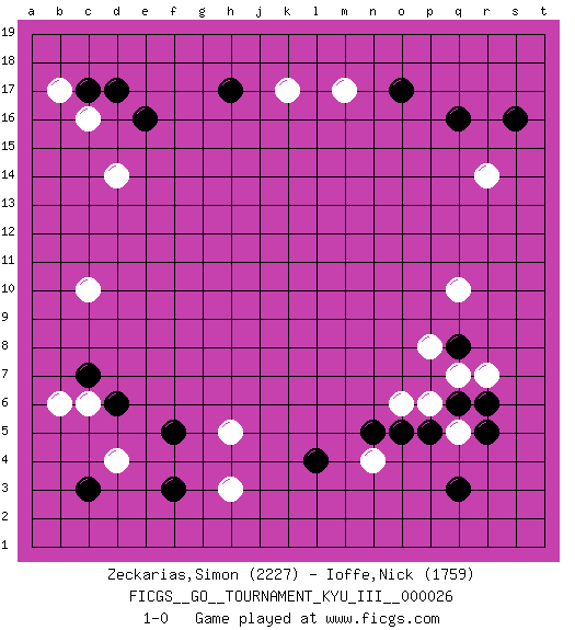 Last move : 1-0 2012 December 9 11:37:41 [Event "FICGS__GO__TOURNAMENT_KYU_III__000026 "] [Site "FICGS"] [Date "2012.10.05"] [Round "1"] [Black "Zeckarias,Simon "] [White "Ioffe,Nick "] [Result "1-0"] [Rating 1 "2227"] [Rating 2 "1759"] 1.q16 d4 2.q3 c16 3.e16 q5 4.q8 n4 5.p5 p6 6.o5 o6 7.n5 q10 8.q6 q7 9.r6 r7 10.r5 p8 11.l4 r14 12.o17 d14 13.c17 b17 14.d17 c10 15.f3 k17 16.h17 m17 17.s16 h3 18.f5 h5 19.d6 c6 20.c7 b6 21.c3 1-0 This go game has been lost on time (started : 2012.10.05 16:27:36) Here are the names of the openings (joseki) played in the four corners : Corner d16 : c16 e16Komoku (Somok, Xiao~mu`) 3-4 Point. The komoku (3-4) point is the traditional corner enclosure move..Ikken Takagakari (Hankan Nop'dakeolch'im, Yi Gaogua`jiao~, 1-Space High Approach). The 5-4 approach move has become more popular in modern times, as modern Go emphasizes speed and influence. Corner q4 : q3 q5Komoku (Somok, Xiao~mu`) 3-4 Point. The komoku (3-4) point is the traditional corner enclosure move..Ikken Takagakari (Hankan Nop'dakeolch'im, Yi Gaogua`jiao~, 1-Space High Approach). The 5-4 approach move has become more popular in modern times, as modern Go emphasizes speed and influence. Corner q16 : q16 r14Hoshi (Hwajeom, Seongjeom, Xingwei`) 4-4 Point. The star or hoshi (4-4) point, emphasizing influence at the potential expense of territory.Ikken Kakari (Hankan Keolch'im, Yi Gua`jiao~, 1-Space Low Approach). White 2 is the standard approach move to the 4-4. Corner d4 : d4 f3Hoshi (Hwajeom, Seongjeom, Xingwei`) 4-4 Point. The star or hoshi (4-4) point, emphasizing influence at the potential expense of territory.Ikken Kakari (Hankan Keolch'im, Yi Gua`jiao~, 1-Space Low Approach). Black 2 is the standard approach move to the 4-4. Player Black won this Go (weiqi, baduk) game.Follow this game move after move (download ) Don't make compact groups of stones. (Anonymous) Perhaps chess is the wrong game for the times (The Chess Master and the Computer, by Garry Kasparov - 2010)