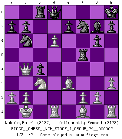 Last move : 1/2-1/2 2007 March 1 22:50:51 [Event "FICGS__CHESS__WCH_STAGE_1_GROUP_24__000002"] [Site "FICGS"] [Date "2007.01.16"] [Round "1"] [White "Kukula,Pawel"] [Black "Kotlyanskiy,Edward"] [Result "1/2-1/2"] [WhiteElo "2127"] [BlackElo "2122"] 1.d4 Nf6 2.Nf3 d5 3.e3 g6 4.c4 Bg7 5.cxd5 O-O 6.h3 Nxd5 7.e4 Nb6 8.Nc3 Nc6 9.Be3 f5 10.exf5 Bxf5 11.Qb3+ Kh8 12.d5 Ne5 13.Nd4 c5 14.Nxf5 Rxf5 15.O-O-O Rc8 16.Kb1 c4 17.Qb4 Nf7 18.d6 1/2-1/2 Queen's pawn game Kingside Castling by player Black (move 5) Queenside Castling by player White (move 15) This chess game ended in a draw. Follow this game move after move (download)You are for me the Queen on d8 and I am the Pawn on d7 !! (Eduard Gufeld) Ein Großmeister muß tausende Partien in seinem Kopf speichern, denn diese sind für Ihn, was die Worte der Muttersprache für gewöhnliche Leute sind, oder Noten für Musiker... (Garry Kasparov) El Ajedrez es un expediente tonto que hace creer a la gente inactiva que hacen una cosa muy astuta cuando solamente estan perdiendo su tiempo. (George Bernard Shaw) Shah mat. Le roi est mort. Cri de fierté d'un joueur venant de terrasser son adversaire, courtoisement, sans effusion de sang. I find television to be very educating. Every time somebody turns on the set, I go in the other room and read a book. (Groucho Marx)